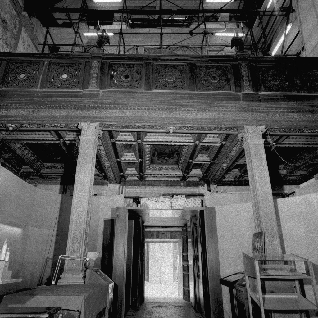 Il soffitto è sotto il coro delle monache detto ''barco''. E' composto da trentadue tele incorniciate da cassettoni scolpiti. Ci sono undici tele negli scomparti centrale e sinistro e dieci in quello destro perchè una tela è stata sottratta anni fa