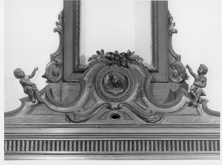 Decorazione plastica con Vergine Addolorata centrale, due putti e decorazione vegetale