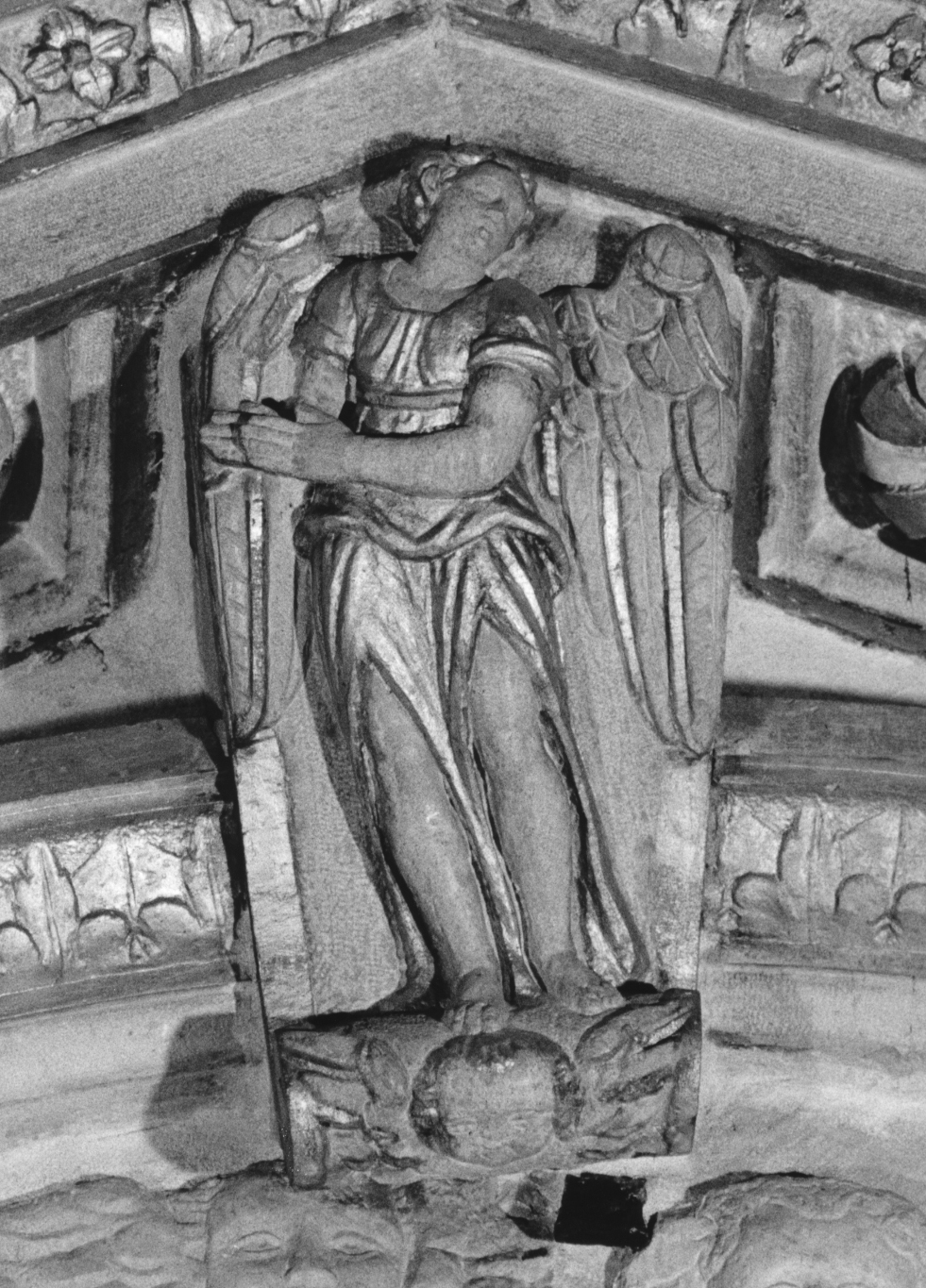 ALTORILIEVO RAFFIGURANTE ANGELO A FIGURA INTERA POGGIANTE SU UNA MENSOLA CON TESTINA DI ANGIOLETTO. VESTE PANNEGGIATA. BRACCIO SINISTRO PIEGATO. ALI. SGUARDO RIVOLTO A SINISTRA