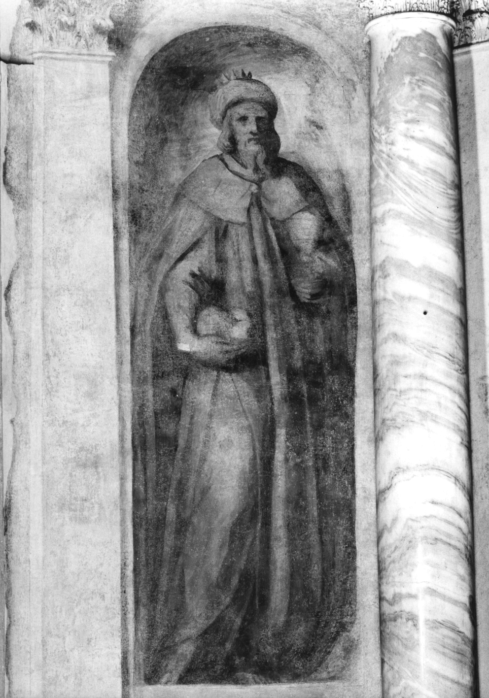 PERSONAGGIO MASCHILE A FIGURA ERETTA ENTRO UNA NICCHIA DIPINTA. VESTE LUNGA CON MANTO. RECA NELLA MANO DESTRA IL PANE. CAPO COPERTO DA TURBANTE CON CORONA