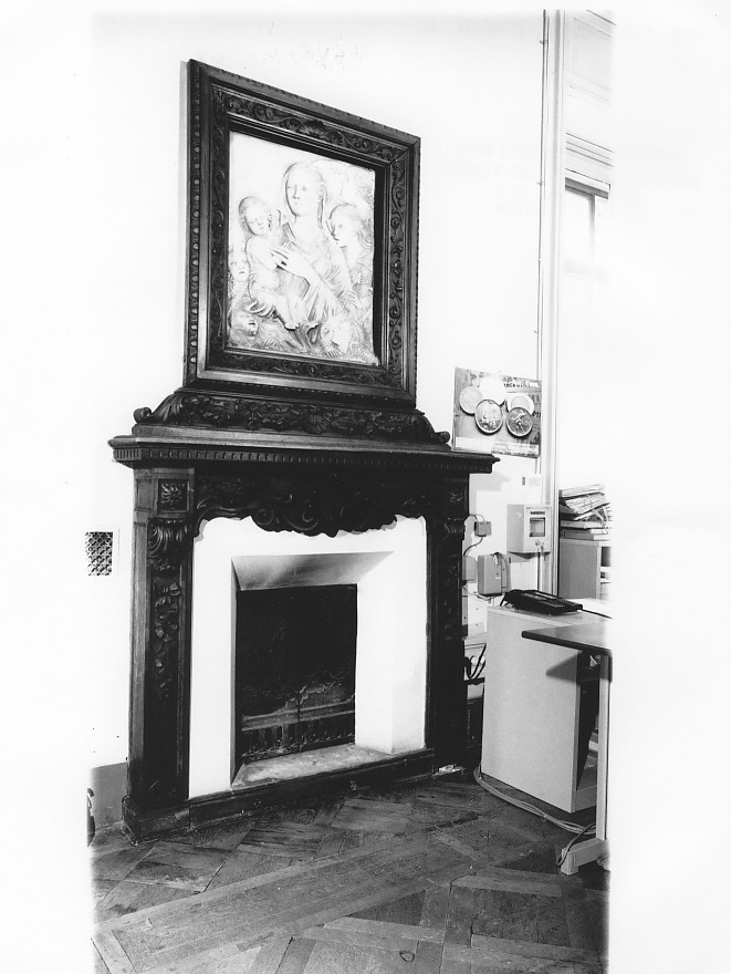 Mostra di caminetto riccamente decorata, sormontata da cornice decorata e contenente rilievo