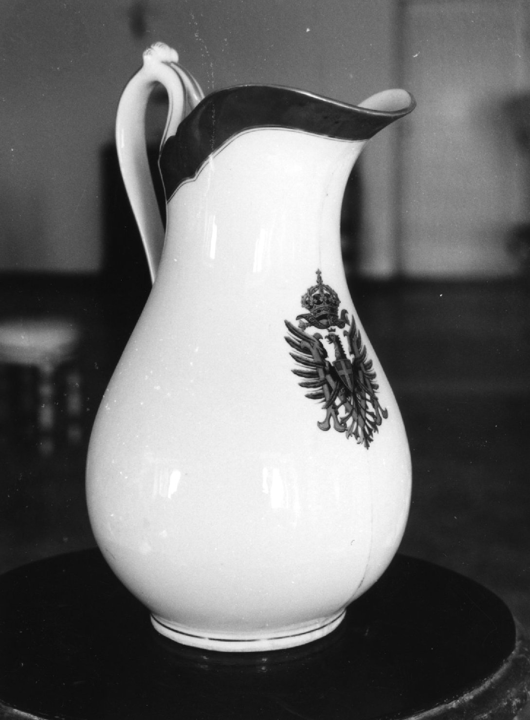 Mesciacqua da toletta a forma di brocca; ha il bordo superiore decorato co n una fascia blu con filettatura dorata; i due esemplari presentano sulla pancia lo stemma sabaudo con l'iniziale l'uno della regina Margherita, l'a ltro del re Umberto