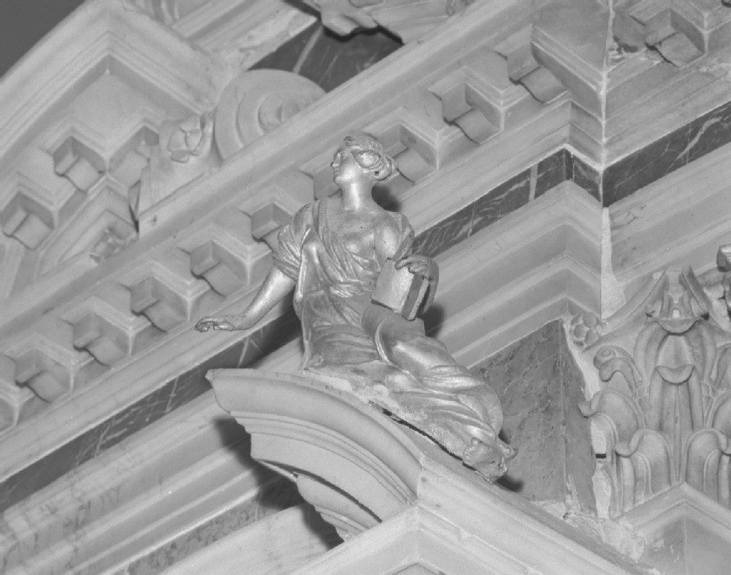 Figura femminile reclinata sul fianco destro, reggente nella mano sinistra un libro aperto e con la mano destra sollevata; veste panneggiata che lascia scoperta la spalla sinistra; capelli scriminati al centro e raccolti in due bande laterali