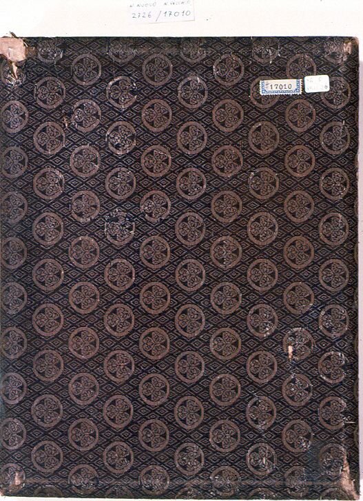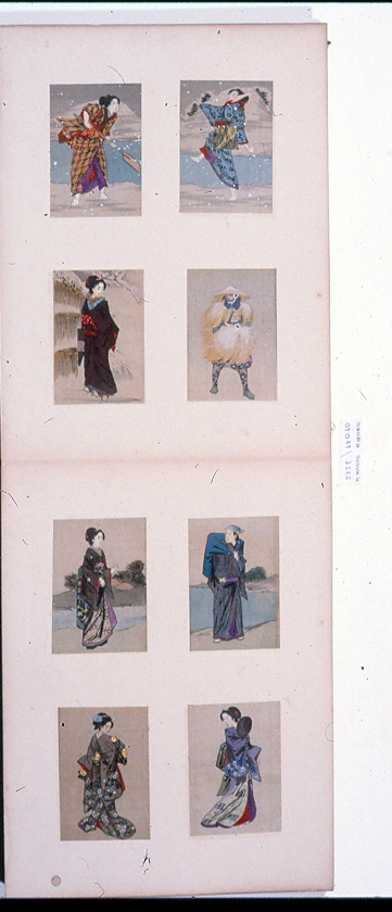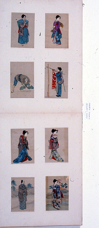 Libro di tipo orihon con copertine di legno rivestito all'esterno di tessuto di cotone e carta marrone e nocciola con motivo di foglie di malva su sfondo di losanghe controguardia cartoncino totale di 51 facciate 4 disegni in inchiostro e colori su seta su ogni facciata per un totale di 204 disegni