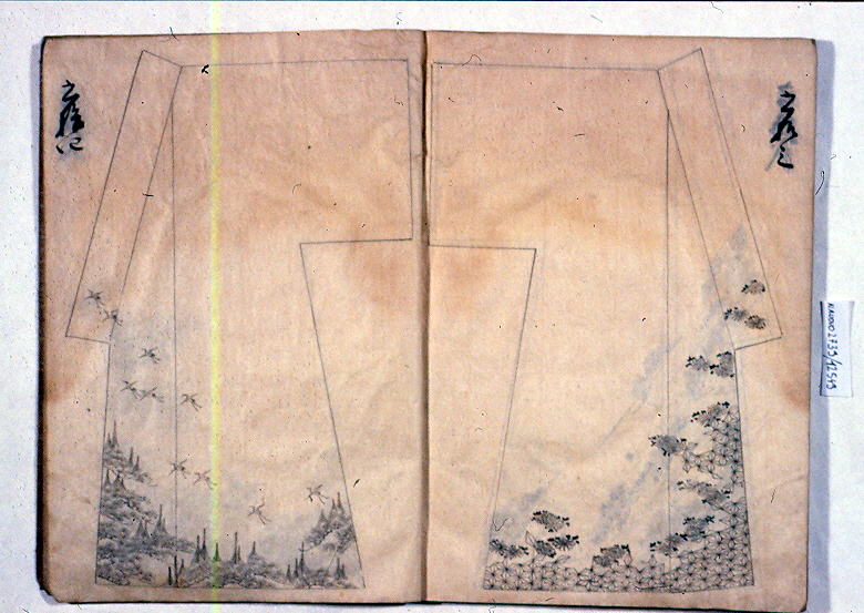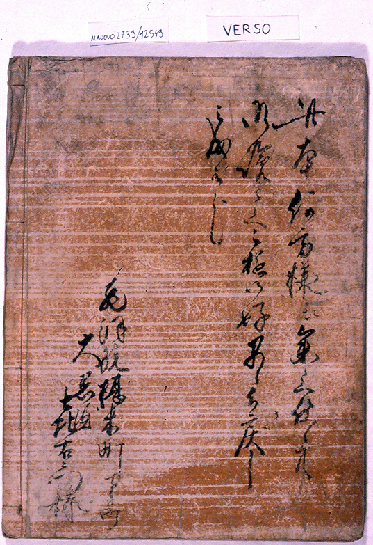 Rilegatura a fukurotoji copertina rigida, che non copre il dorso, di washi stampato a fasce e righe nocciola su fondo beige controguardia in washi 1 rinforzo per gli angoli in tessuto di seta totale di 34 fogli piegati e 1 singolo disegni in inchiostro nero per un totale di 68 colophon in inchiostro nero scritto in posizione centrale sulla copertina recto
