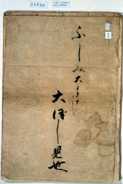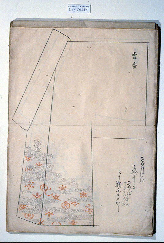 Rilegatura a fukurotoji copertina non rigida, che copre il dorso, di washibeige totale di 28 fogli singoli di misure diverse disegnati su una sola facciata disegni in inchiostro nero e colori per un totale di 25 disegni di modelli per kimono e 1 di soggetto diverso/ colophon scritto in inchiostro in posizione centrale sulla copertina recto e numerose altre iscrizioni