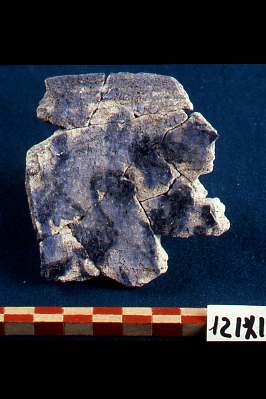Bordo di piatto in ceramica ad impasto artificiale, dipinta in blu nero e con vetrina alcalina