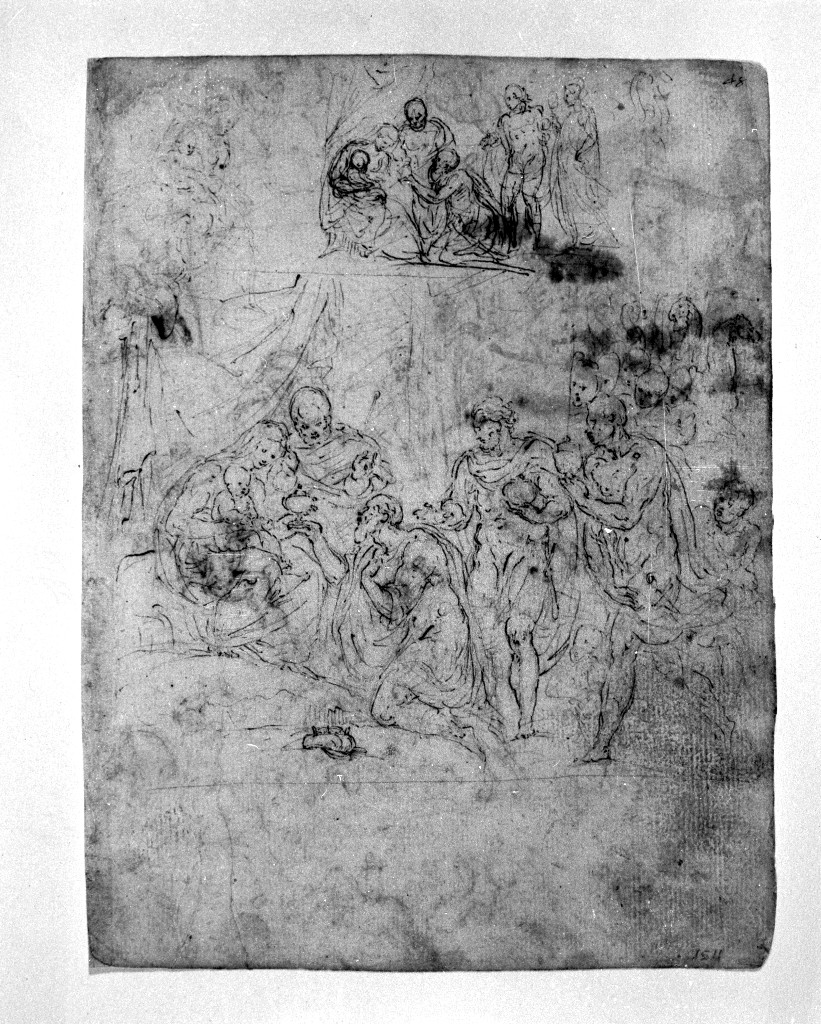 • NOTIZIE STORICO CRITICHE Ben quindici schizzi per il Sant'Ambrogio a cavallo si ripetono in questo foglio, mutando la posa del del muso del cavallo, del braccio del santo e degli ariani. Nei due schizzi della matà superiore, di cui uno acquarellato, un gruppo di figure con lo stendardo, destinate a scomparire nel dipinto, segue il santo cavaliere. L'idea di un'Adorazione dei Magi risale al 1590 circa, come dimostra la contemporaneità con il tema del Sant'Ambrogio a cavallo disegnato nel recto del foglio. La composizione che si ritrova soltanto nel foglio inv. n. 6967 o di Windsor, è ripetuta in un piccolo schizzo anche nella parte superiore di questo foglio, accanto ad un abbozzo della sola Vergine con il bambino. La Madonna è situata, davanti a una tenda, non al centro della composizione, bensì sulla sinistra, con il San Giuseppe al suo fianco e il Bambino in braccio, mentre riceve i doni dei tre Magi, uno dei quali è inginocchiato davanti a lei: sullo sfondo a destra si affaccia un gruppo di teste, dietro a cui spuntano i lunghi i colli e i musi dei cammelli. La squisita composizione segue un ritmo mosso, scandito dalle pose delle figure un po' forzate e si ferma sul re adorante, dall'attaggiamento sinuoso, inginocchiato al centro in primo piano. Nessuna adorazione si riscontra tra le opere note, nè tra quelle perdute (...)