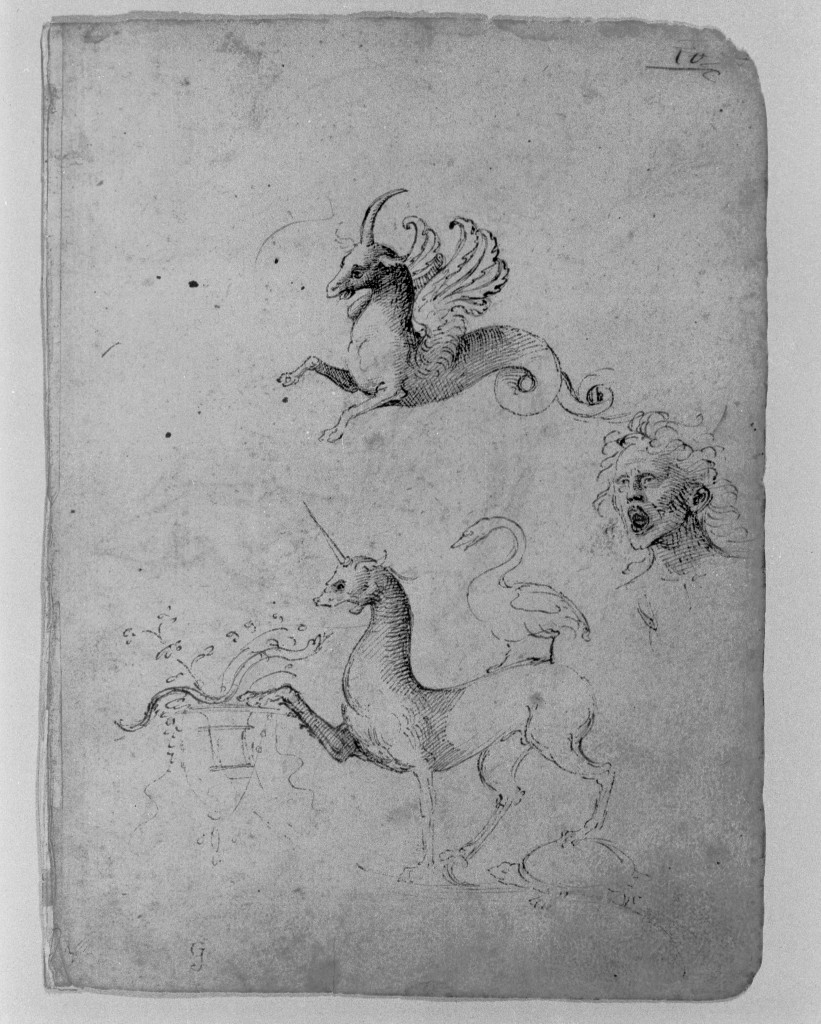 - NOTIZIE STORICO CRITICHE Il gruppo scherzoso degli animali in basso, con l'unicorno, che reggendo un cigno sul dorso appoggia una zampa sopra una tartaruga, spaventato alla vista di un serpente, è un tipico motivo di decorazione a grottesche dell'ambito di Perugino e Pinturicchio anche se non si trova tale e quale in nessun'opera di questi artisti. Motivi similmente scherzosi si trovano per esempio nelle vele del soffitto della Loggia del Palazzo Colonna ai santissimi Apostoli a Roma dipinte da Pintoricchio, che derivano in parte da rilievi antichi tuttora conservati, e nel soffito del Collegio del Cambio a Perugia dipinto dal Perugino. Lo stesso vale anche per gli altri due motivi. Nella "G" in basso a sinistra il Kahl vedeva una conferma della sua ipotesi che Girolamo Genga fosse l'autore del libretto (...)