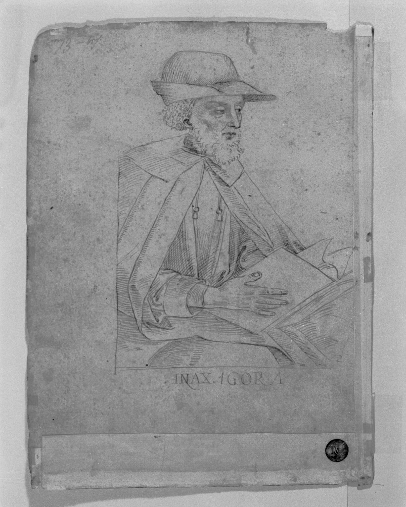 - NOTIZIE STORICO CRITICHE Il ritratto di Vittorino da Feltre riprodotto sul recto di questo disegno si trovava, nello studiolo di Urbino, sulla parete est accanto a quello di Euclide che non compare invece nel libretto veneziano. Il ritratto di Solone sul verso erroneamente interpretato nella scritta come quello di Anassagora, è collocato sulla parete sud accoppiato con quello di Bartolo. Di Solone esiste un disegno-copia alla Galleria Nazionale delle Marche eseguito dalla stessa mano. Entrambi i ritratti di questo foglio sono stati malamente ritoccati a penna e inchiostro nero da una mano posteriore: il primo lungo tutto il profilo che ha assunto perciò un aspetto caricaturato, il secondo in corrispondenza dei capelli, dell'orecchio e del cappello