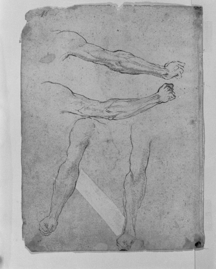 - NOTIZIE STORICO CRITICHE Per la sua fisionamia ossuta, la testa in alto, rimanda a tipi pollaioleschi, quella in basso a sinistra deriva invece da un disegno di Leonardo, che è stato copiato anche da Raffaello su un foglio attualmente conservato all'Ashmolean Museum di Oxford: quest'ultimo è databile intorno al 1505 poichè contiene da una parte schizzi tratti dalla Battaglia di Anghiari e dall'altra studi per l'affresco della chiesa di San Severo a Perugia; certe somiglianze fisionomiche e specialmente la guancia molto pronunciata indicano come il prototipo seguito dall'autore del libretto veneziano sia stato il disegno raffaellesco piuttosto che quello di Leonardo. La testa in basso a destra riproduce in forma più dettagliata quella di un pastore disegna to da Raffaello nello studio di composizione, attualmente a Stoccolma, per l'Adorazione dei Magi e dei pastori nella predella della Incoronazione della Vergine della Pinacoteca Vaticana. La testa sul libretto veneziano sembrerebbe tuttavia presupporre l'esistenza di un altro disegno, nel quale lo stesso Raffaello doveva aver studiato questo particolare in forma ancora più precisa e in dimensioni maggiori. (...) I quattro studi di braccia su l verso rientrano nell'ambito delle esercitazioni anatomiche, ispirate a disegni del Pollaiolo che anche Raffaello conosceva come dimostra un suo studio al British Museum