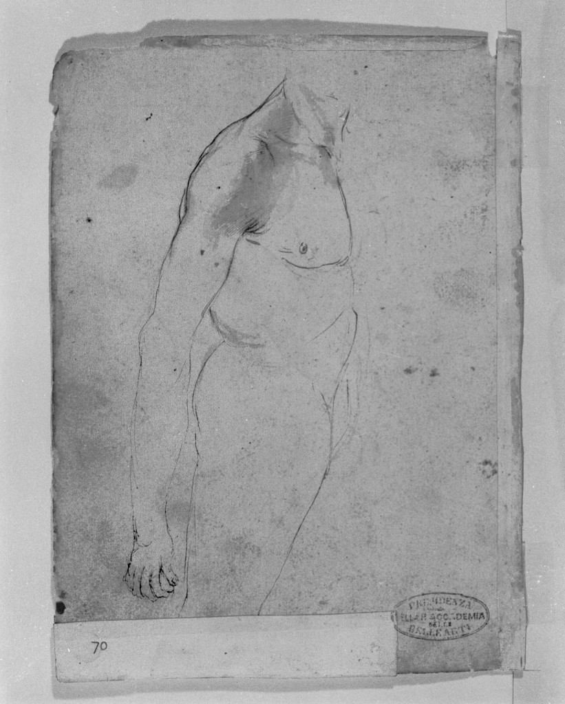 - NOTIZIE STORICO CRITICHE I disegni che compaiono su questo foglio sono del tipo di quelli già visti sul verso del foglio precedente. Essi sono ritoccati ad acquerello in corrispondenza della spalla centrale sul recto e di parte della figura sul verso, dove anche la mano deriva da una aggiunta posteriore: soprattutto lo schizzo sul verso, in tal modo deturpato, risulta oggi di lettura molto difficile