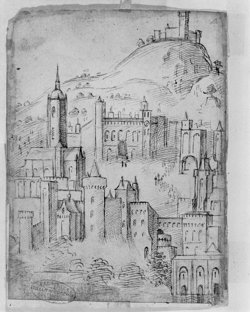 - NOTIZIE STORICO CRITICHE Per quanto riguarda gli schizzi sul recto, per il frammento di paesaggio si rimanda alla scheda cat. n. 00250337, la mano e la testa grande sono così pesantemente ripassate che è impossibile capire se al di sotto possa esserci un disegno originale e quale potrebbe essere il suo eventuale aspetto, e molto difficile da giudicare è lo schizzo di testa più piccolo. Fischel considerava la mano e le due teste disegni originali , avvertendo che la testa di dimensioni maggiori sarebbe stata scarabocchiata dall'artista in atto di rifiuto. La veduta di una città in collina sul verso, che si estende sul recto del foglio successivo, non è stata finora identificata. Il Bossi aveva annotato sulla pagina corrispondente del suo album "Narni" e "Urbino" ( che si trova sul verso del foglio cat. n. 00250339 ), mentre il Passavant pensava che potesse identificarsi con Gubbio; si tratta in ogni caso di una città umbra, forse ripresa da un disegno di Raffaello che poteva rappresentare tanto una veduta reale, quanto una combinazione fantastica di vedute diverse