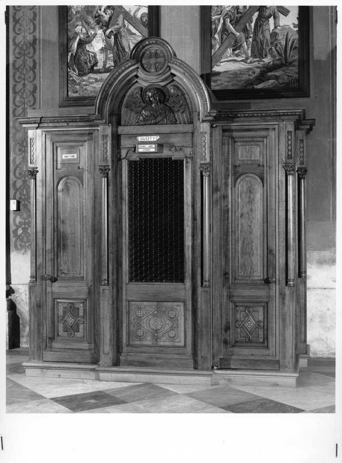 Composto di colonnine e cimasa ad arco, sopra la parte centrale, con il busto di un angelo con le mani incrociate