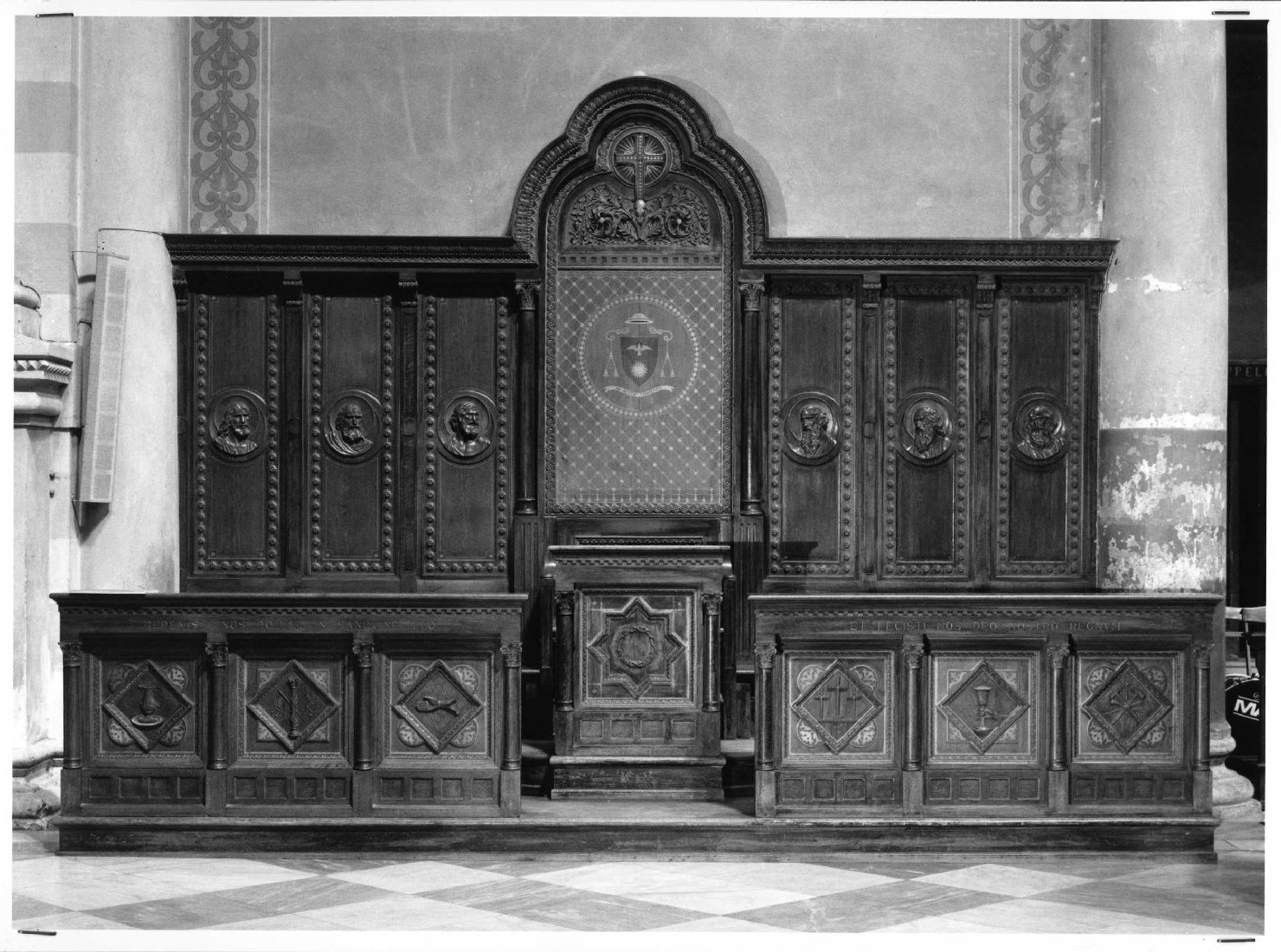Stalli con cattedra centrale e motivi decorativi geometrici, fitomorfi, teste di apostoli in clipeo e simboli della Passione