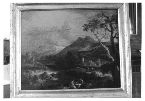 olio su tela, la scena rappresenta un paesaggio montano con due monaci in primo piano; sullo sfondo un uomo con asino ed alcune case, a sinistra un fiume con due donne e ruderi