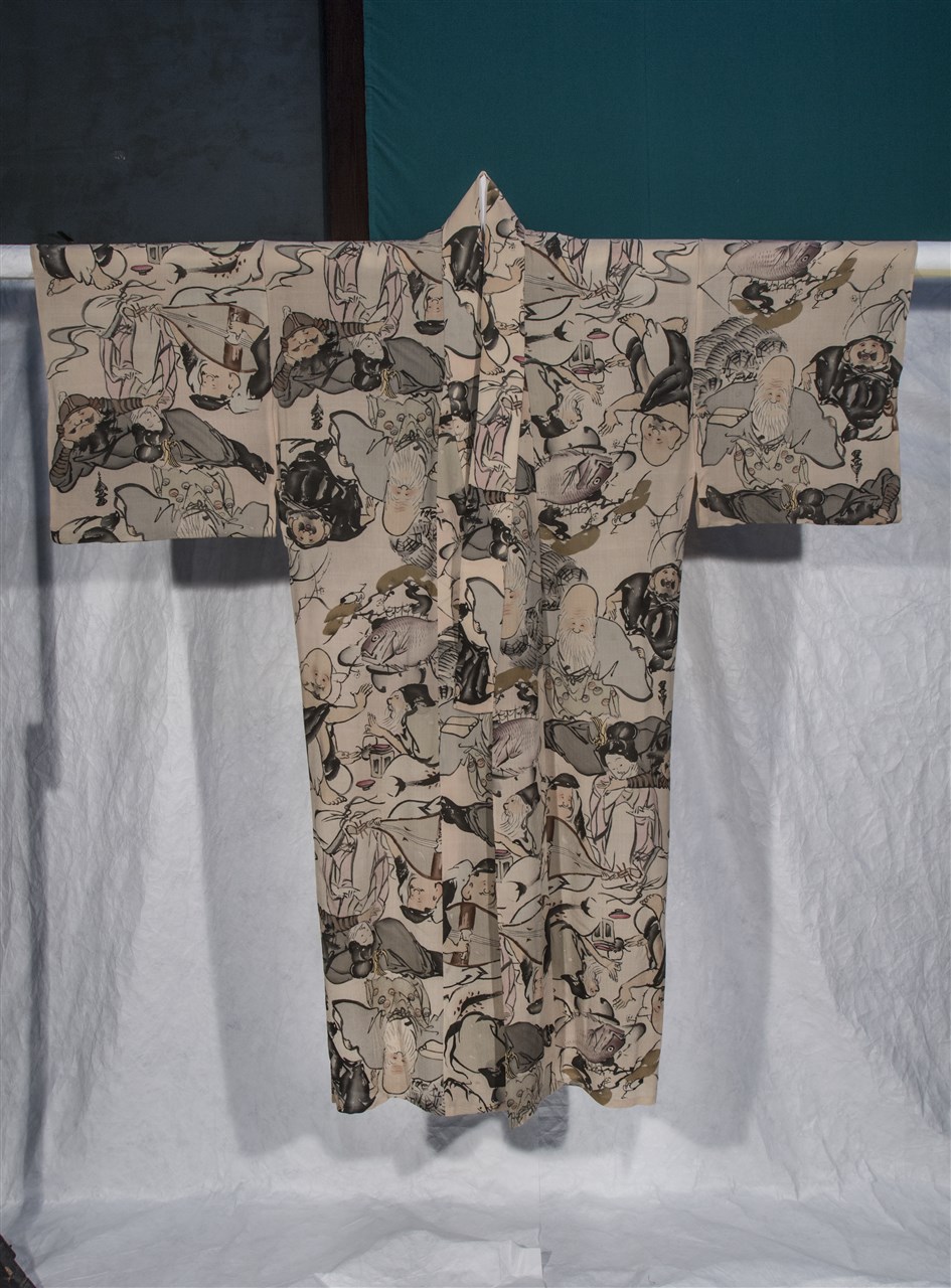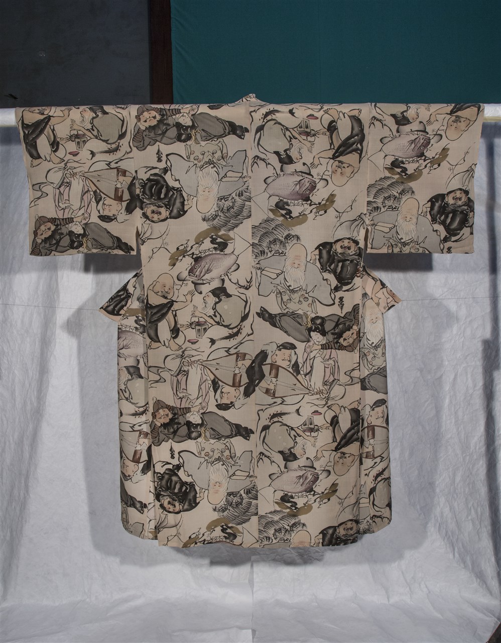 - NOTIZIE STORICO CRITICHE Abito sfoderato, del tipo nagajuban: sottokimono. Il motivo decorativo che si ripete su tutta la pezza ogni 100 cm ca, rappresenta le sette divinità della fortuna (shichifukujin 七福神) . Ognuna di queste divinità ha delle caratteristiche marcate: Ebisu, protettore dei marinai e della pesca, con il pesce e la canna da pesca, Daikoku, dio della fortuna, con il grande sacco, il martello e il riso, Bishamon, in armatura, Benzaiten, protrettrice del matrimonio, della musica è l'unica divinità femminile, Fukurokuju, dio della saggezza dall'enorme testa pelata, Hotei con la grande pancia in vista e Jurōjin dio della longevità accanto al cervo (W. F. Weber, "Ko-JI-Hô-Ten dictionnaire a l'usage des amateurs et collectionneurs d'objets d'art japonais et chinois", New York 1975, singole voci). In museo esiste un "tan" (inv. nn.1256/13521) rotolo di seta per confezionare kimono, con il medesimo motivo decorativo su fondo verde/azzurro