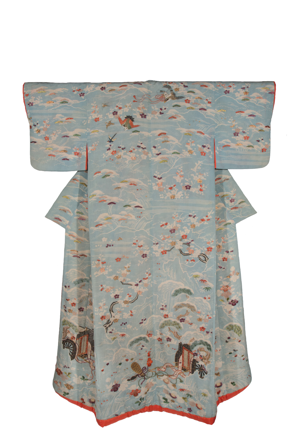- NOTIZIE STORICO CRITICHE Il motivo decorativo, ottenuto a riserva, è perlopiù lasciato bianco (shiro age), aggiungendo colore solo con il ricamo, la tintura a mscherina e l'applicazione di oro filato. Probabilmente si tratta di un riferimento al capitolo XXIX del Genji Monogatari: Mijuki, Il corteo di caccia imperiale esplicitato dalla scena di caccia disegnata nella parte alta dell'abito, ove compare il falcone che caccia la gru della Manciuria, mentre nella parte inferiore dell'abito risaltano due sfarzosi carri utilizzati dalle dame dell'aristocrazia di epoca Heian, dai quali fuoriescono lunghi strascichi di tessuto (E. de Concini)
