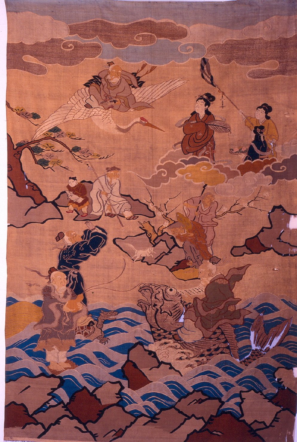Arazzo con ricami su fondo marrone chiaro. Rappresenta figure poste sopra le nubi, probabilmente divinità