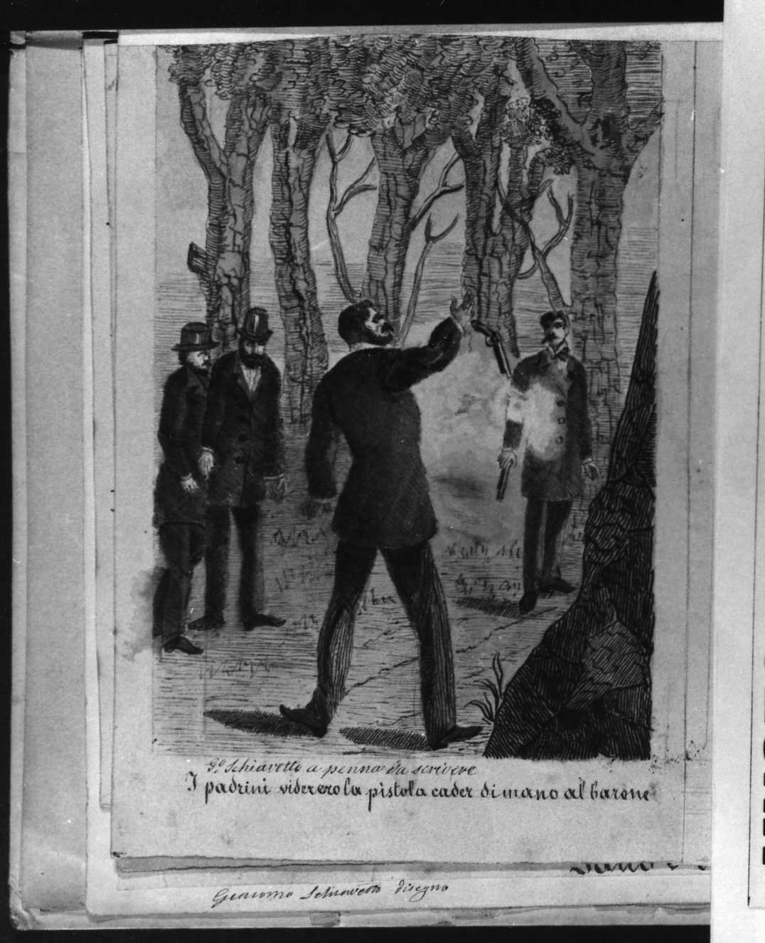 - ISCRIZIONI in basso - G.mo Schiavetto a penna da scrivere / I padrini viderero la pistola cader di mano al barone - corsivo - a penna -