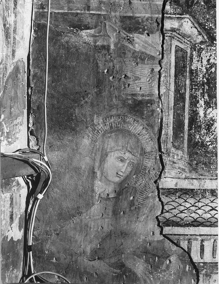 Dipinti eseguiti sulla parete soprastante il dossale.Nell'ordine, da destra verso sinistra, sono raffigurati:Crocifissione di cui si intravede in alto parte della croce marrone, della mano destra del Cristo e di tessuto ocra, forse il mantello di un angelo; in basso una delle Pie Donne (manto rosso e veste verde), con aureola dorata, regge la Madonna svenuta, di cui si scorgono le mani, il rosso mantello l'aureola; fondo blu e cornice rettangolare profilata di verde; Santa Caterina d'Alessandria pare di riconoscere la ruota spezzata marrone e la mano destra reggente la palma del martirio; Santo di cui si intravede una mano; profilatura verticale a motivo geometrico;Campiture illegibili di colori chiari