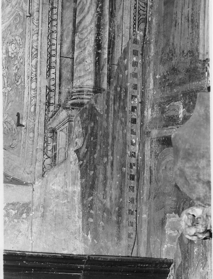 Dipinti eseguiti sulla parete soprastante il dossale. Nell'ordine, da destra verso sinistra, sono raffigurati:Crocifissione di cui si intravede in alto parte della croce marrone, della mano destra del Cristo e di tessuto ocra, forse il mantello di un angelo; in basso una delle Pie Donne (manto rosso e veste verde), con aureola dorata, regge la Madonna svenuta, di cui si scorgono le mani, il rosso mantello l'aureola; fondo blu e cornice rettangolare profilata di verde; Santa Caterina d'Alessandria pare di riconoscere la ruota spezzata marrone e la mano destra reggente la palma del martirio; Santo di cui si intravede una mano.In particolare qui vediamo uno scorcio difronte,prbabilmente, identificabile con una Pia Donna a motivo geometrico, invece altre campiture sono illegibili e di colori chiari