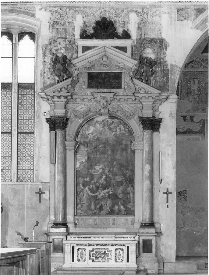 - ISCRIZIONI DEIPARAE VIRGINI/IOSEPHO Q/ILLIUS MARITO/ HYERONYMO ET ANTONIO/ PATRONIS SANCTISSIMIS/COLLEGIVM FABROR. LIGNAR/ D.D.M.D. CVIII - lettere capitali - a rilievo -