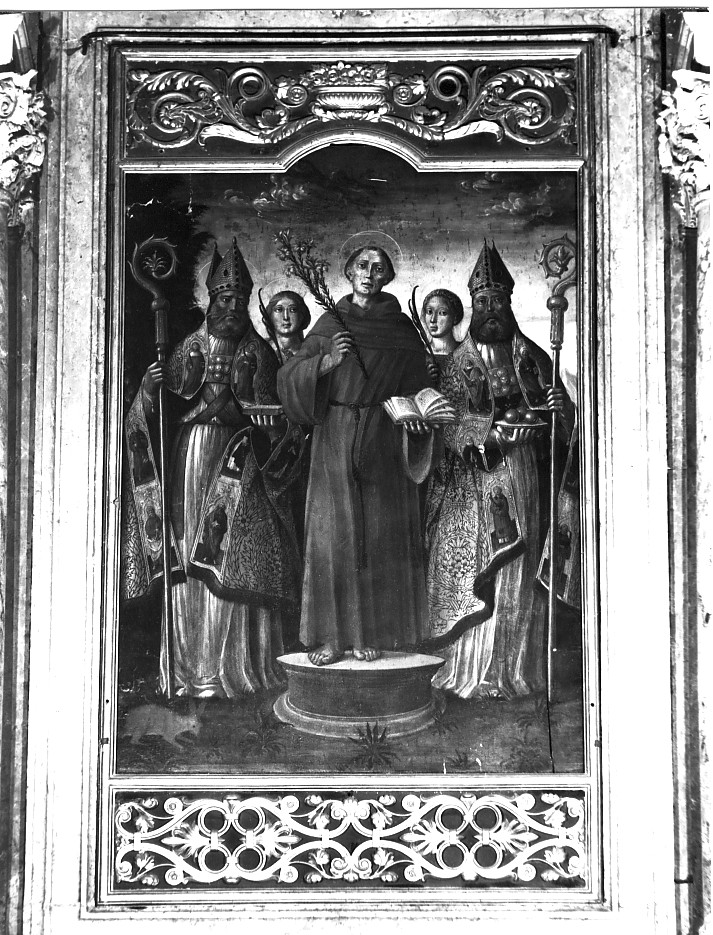 La cornice, laccata color oro, è data da un bordo liscio che circonda la tavola e la copre in alto (non si sa di quanto), dove al centro è sagomata una piccola centina. Sopra e sotto stanno due aggiunte con fregi dorati su fondo blu cupo