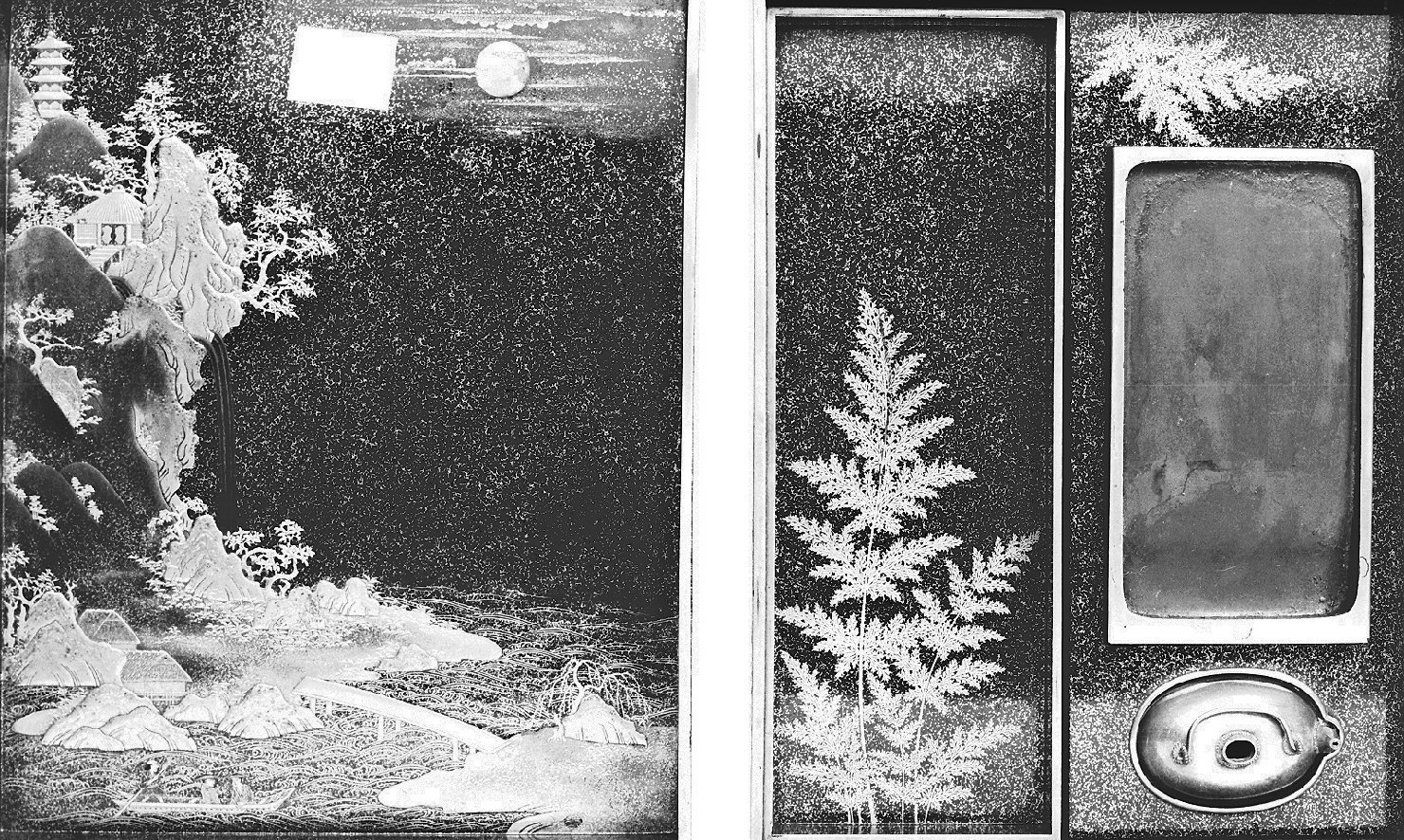 Scatola per scrittura (suzuri bako). Decorazione con pini e paesaggio