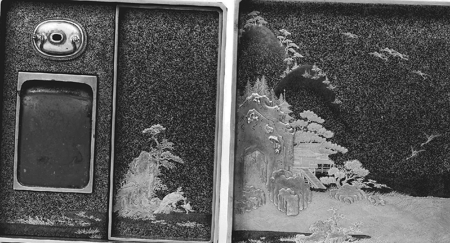 Scatola per scrittura (suzuri bako). Decorazione con ventagli e paesaggi