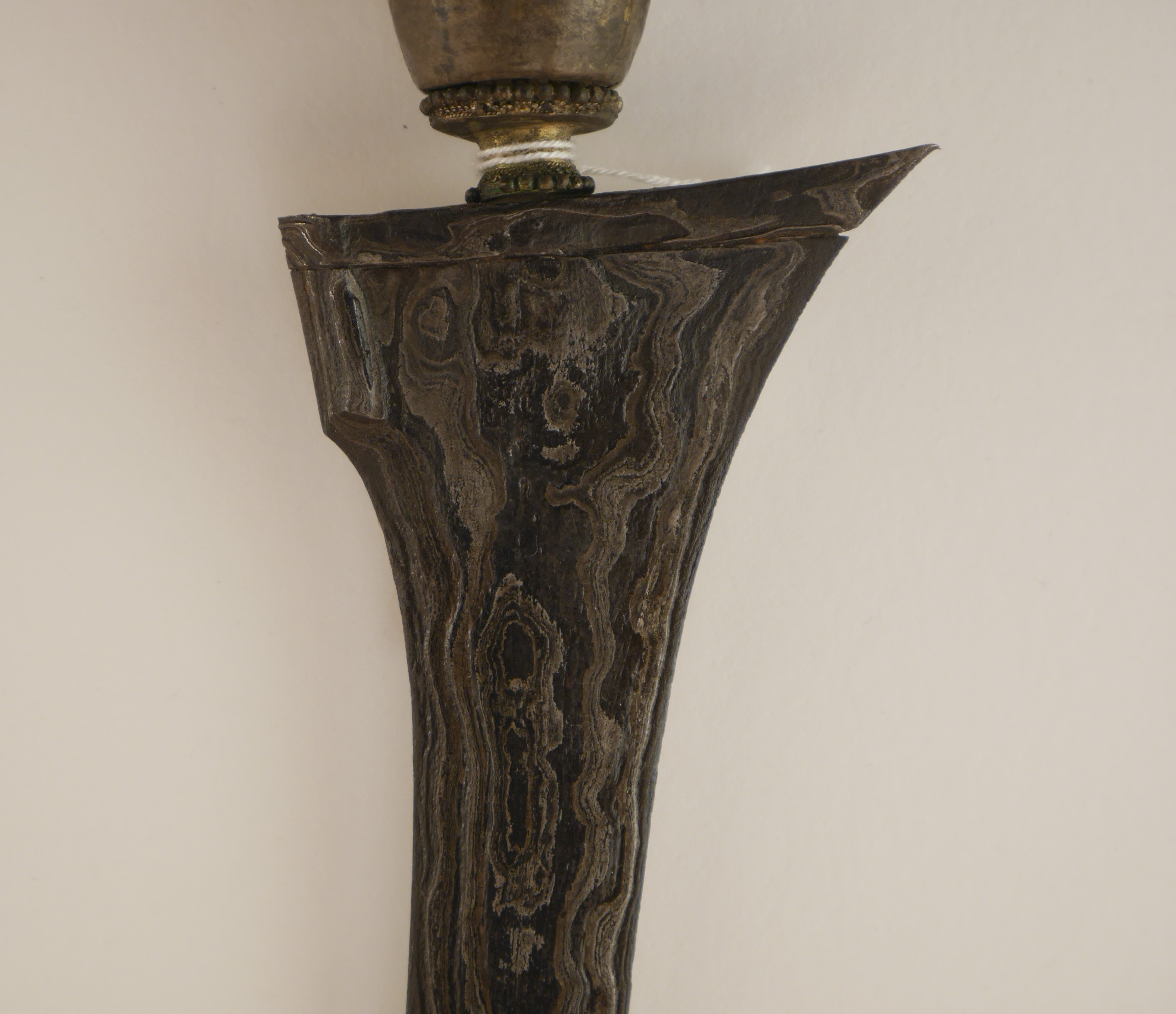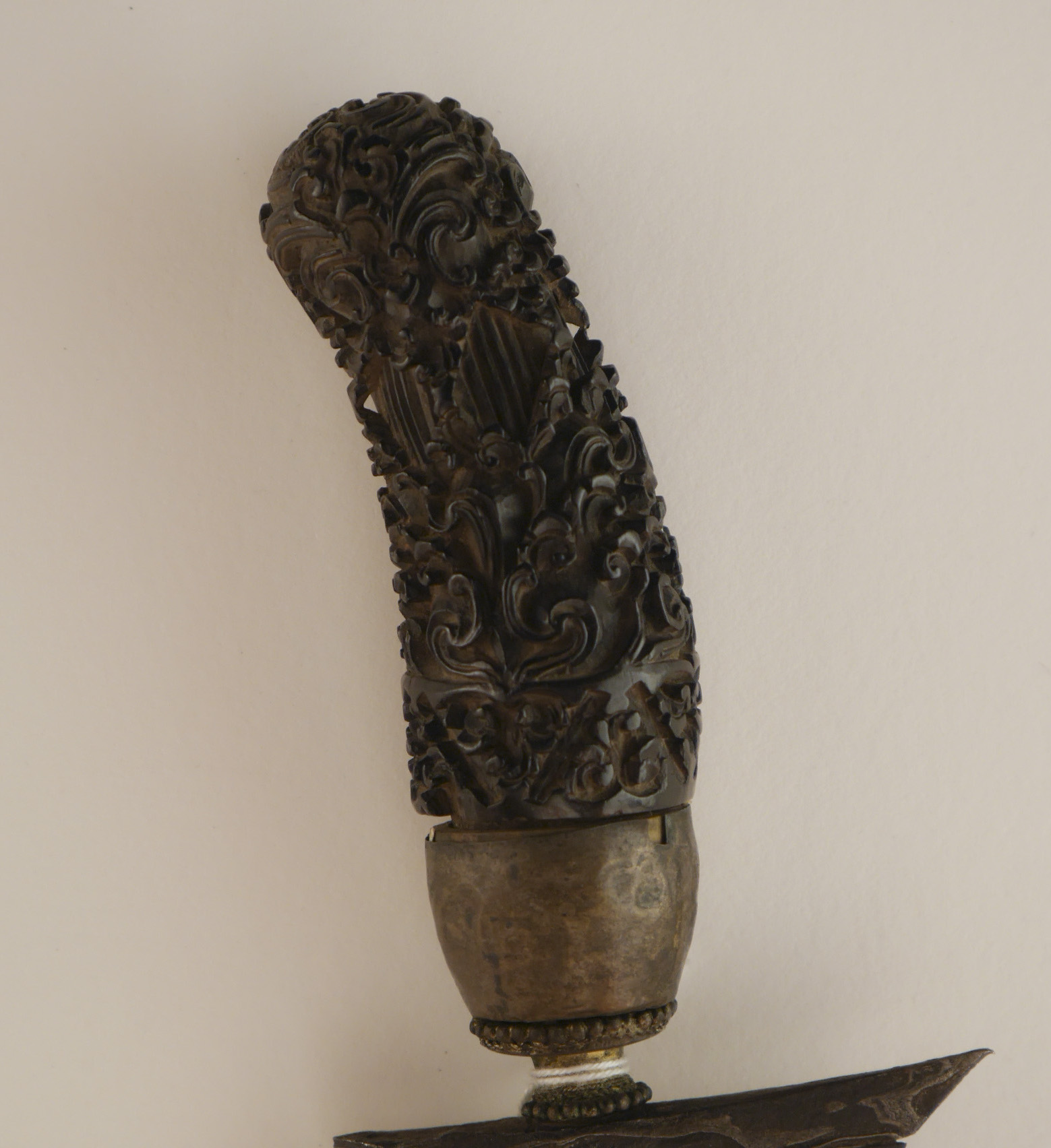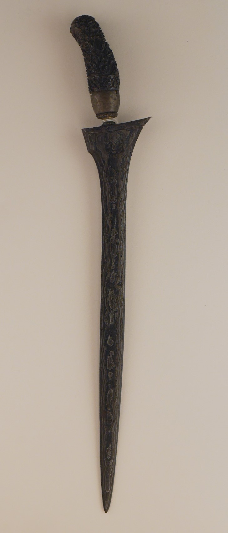 Keris privo di fodero e proveniente dalla regione settentrionale dell'isola di Giava. L'eccezionale impugnatura (ukiran) è realizzata in corno di bufalo nero (tanduk kerbau) in uno stile denominato floreale, che potrebbe rappresentare l'estrema stilizzazione della figura di un demone (raksasa) nascosto da una spessa cortina vegetale. Il manufatto si innesta alla base su una porzione di legno a sua volta ricoperta da un elemento metallico in forma di coppa (selut), e poggia su un ulteriore componente (mendak) – realizzato anch'esso in metallo e di forma tipicamente giavanese – che separa l'impugnatura dalla lama. Quest'ultima, dritta (lurus), è di tipo dapor brojol e presenta una caratteristica damaschinatura denominata pamor ngulit semangka