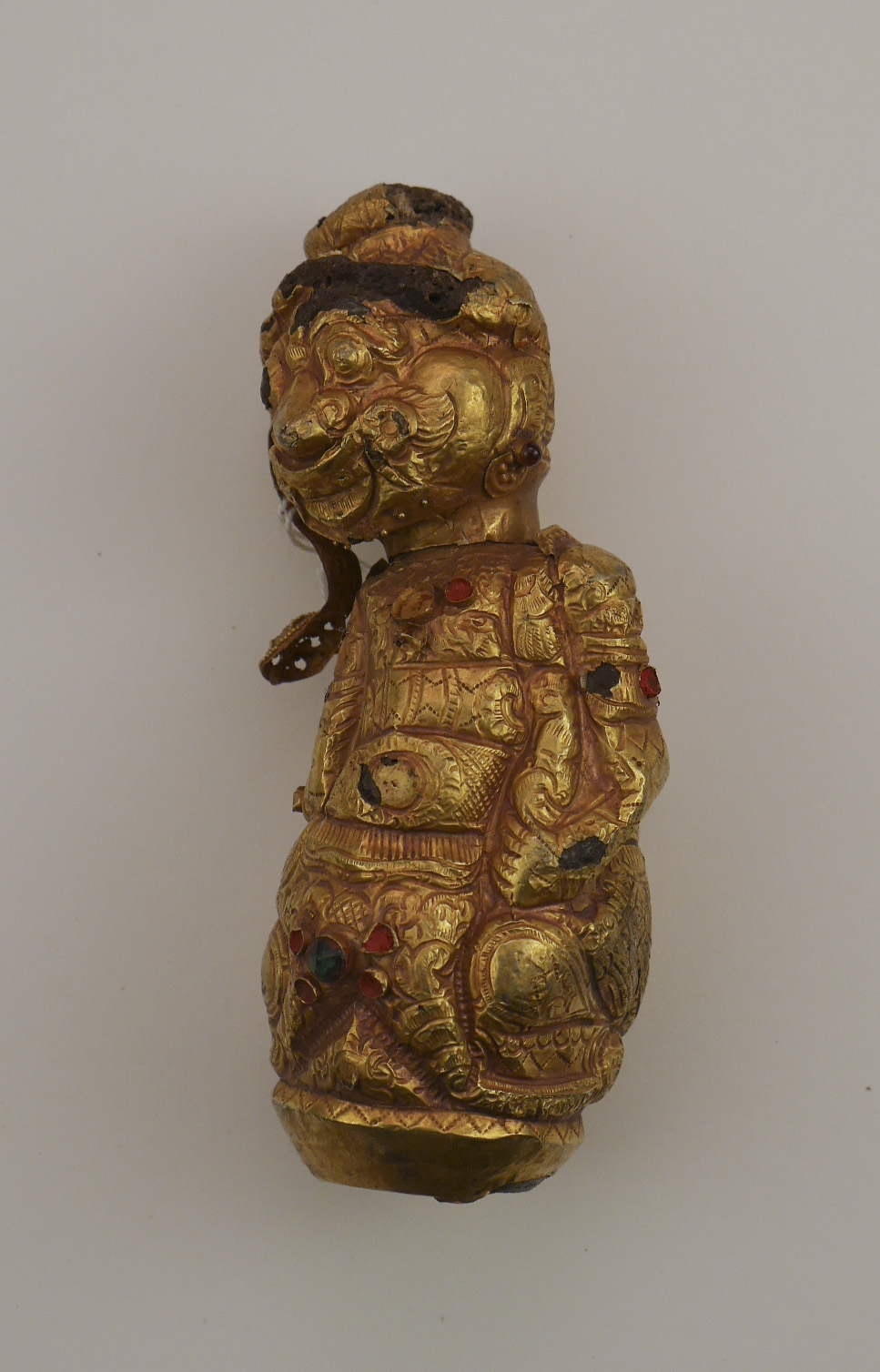 Impugnatura di keris proveniente da Giava Centrale o Orientale. Rappresenta un demone (raksasa) con la testa leggermente reclinata e assiso su un trono di tipo tumpal decorato con il tipico motivo a triangoli contrapposti. È realizzato con un impasto contenente terre e resine vegetali completamente ricoperto da una sottile lamina in lega metallica – probabilmente swassa, contenente oro, argento e rame; lievi lacune della copertura mostrano la struttura sottostante. La figura reca diversi minuti castoni decorati con pietre colorate e gemme in pasta vitrea collocati alla base e a ricreare monili sulle braccia, il collo e le orecchie