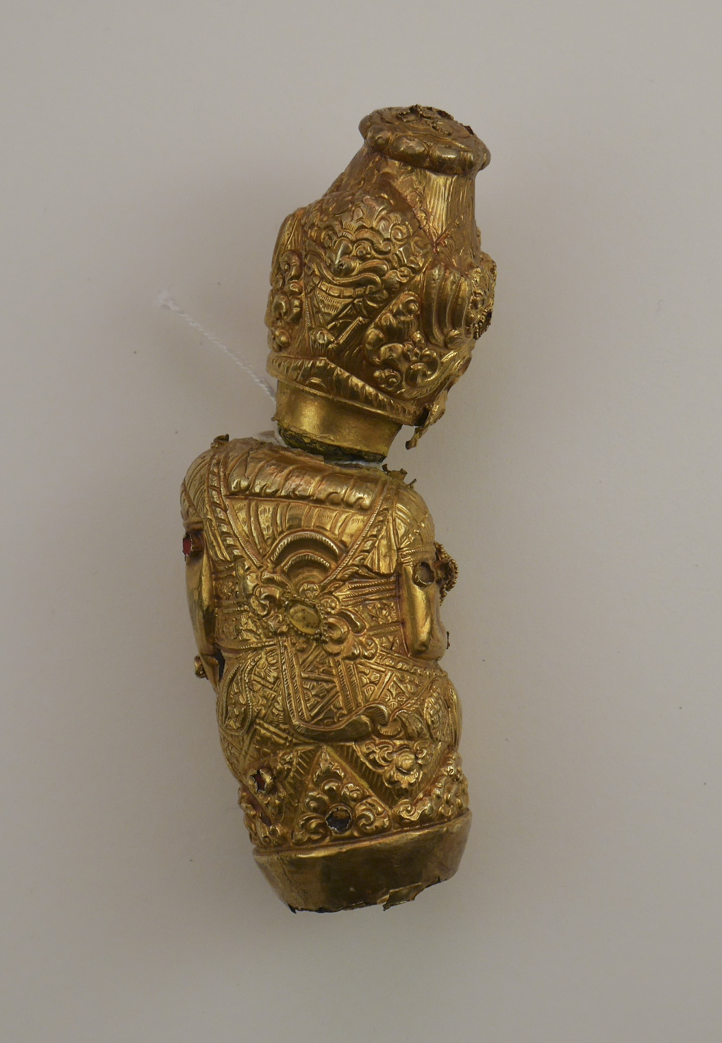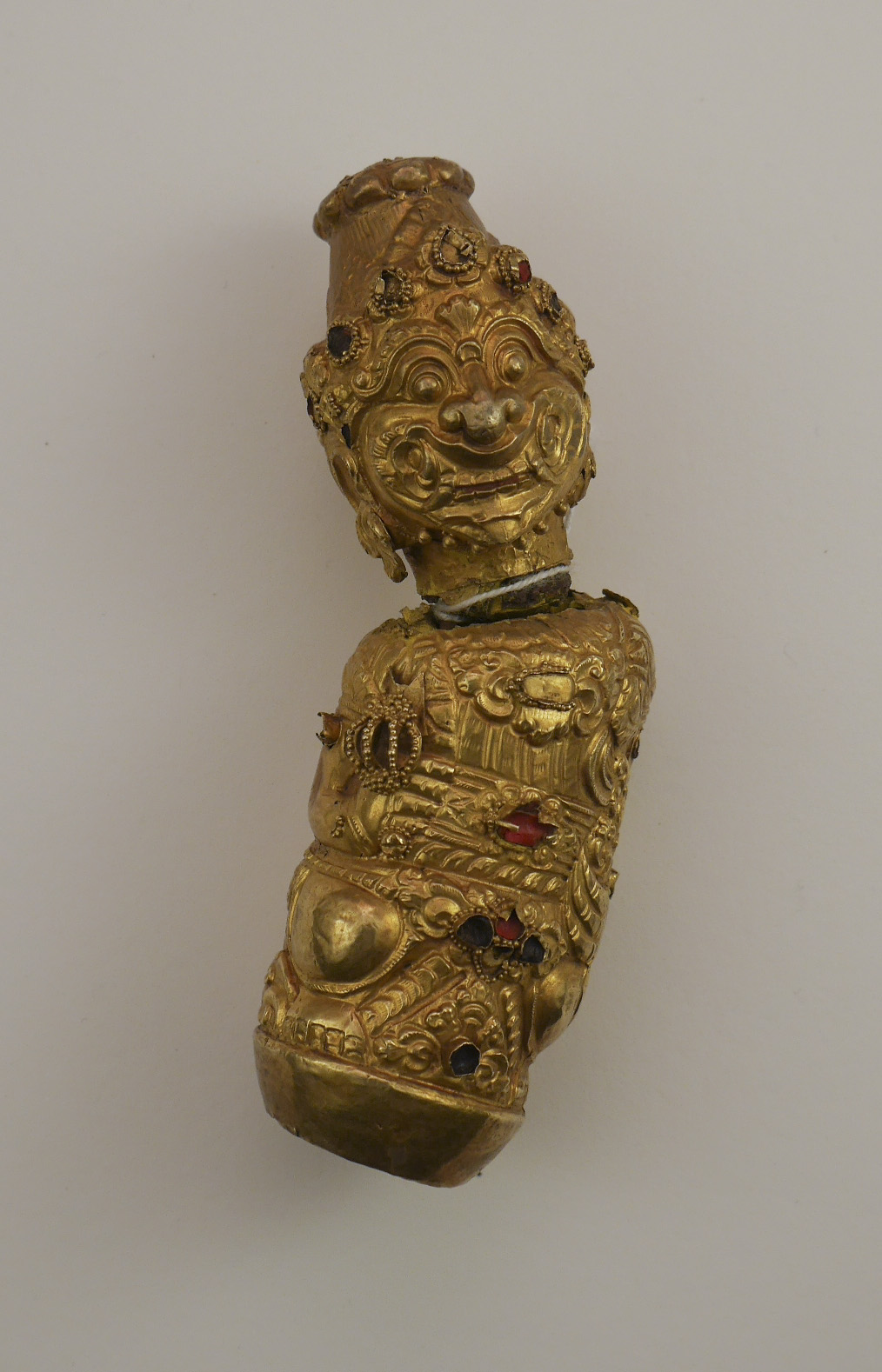 Impugnatura di keris proveniente da Giava Centrale o Orientale. Rappresenta un demone (raksasa: si noti il dettaglio delle lunghe zanne arcuate che protrudono dalle fauci) o un semidio assiso su un trono di tipo tumpal decorato con il tipico motivo a triangoli contrapposti; è vestito con abiti sontuosi e ricamati e reca diversi castoni con pietre colorate e gemme in pasta vitrea (alcune mancanti) che decorano il trono, la base, la fibbia della cintura, le braccia e quella che sembra essere una mahkota – corona reale – o un complicato copricapo a simboleggiare il rango elevato del personaggio, che oltretutto – per rimarcare il proprio status sociale – stringe uno scettro, decorato a granulazione. Sulla nuca si può apprezzare il dettaglio del garuda mungkur, talismano che poteva essere indossato solo da rajah e da patih (viceré o ministri). L'impugnatura è realizzata in lamina metallica cesellata – probabilmente swassa, contenente oro, argento e rame – applicata su una base costituita da un amalgama contenente terre e resine vegetali; si può notare alla base un canale creato mediante un sottile tubo in rame inserito nell'impasto e destinato ad accogliere il codolo (pesi o peksi) dell'arma