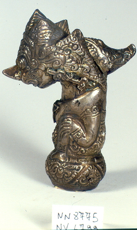 Impugnatura di keris proveniente da Giava Orientale; di tipologia nyamba, rappresenta una figura del teatro delle ombre wayang. Adornata con una corona e con lunghi capelli che ricadono sulla schiena, è rappresentata seduta su una sfera che fa da base, decorata con un motivo a triangoli contrapposti denominato tumpal. L'impugnatura è realizzata con una struttura costituita da un impasto contenente terre e resine vegetali ricoperta con una lamina cesellata in lega d'argento
