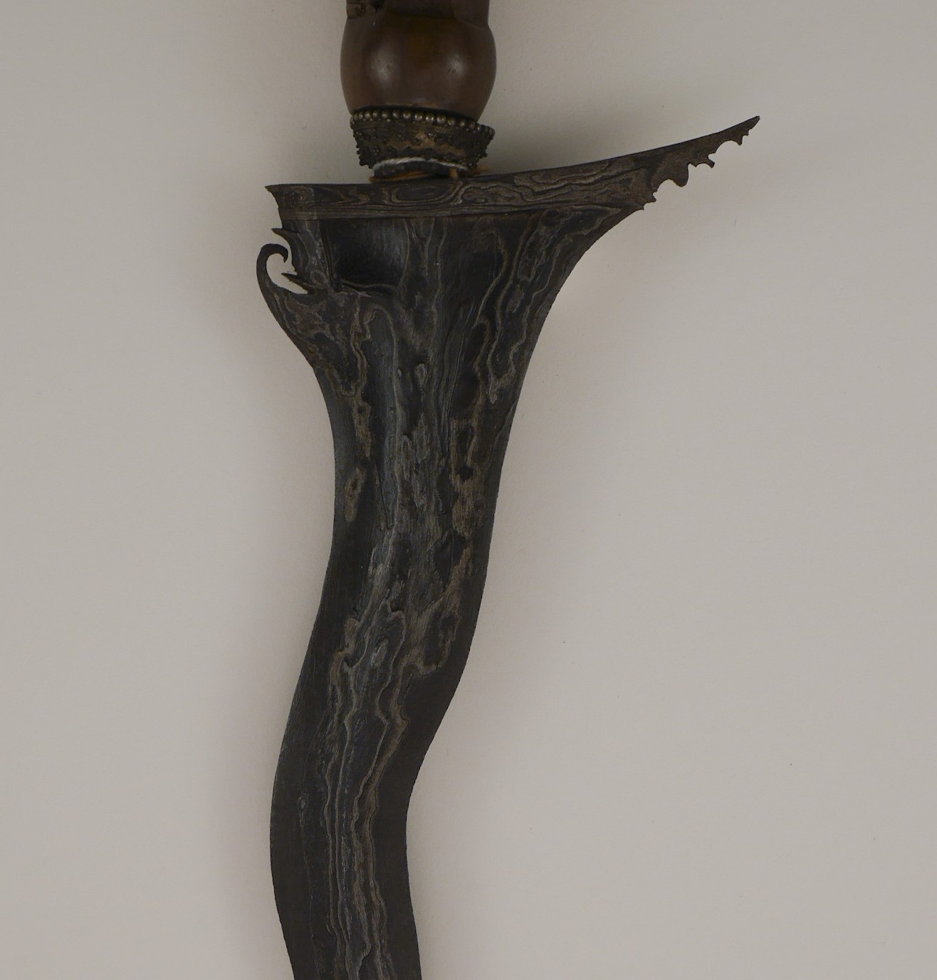 Keris privo di fodero proveniente da Yogyakarta, Giava centrale. L'impugnatura (chiamata specificatamente deder o djedjeran a Giava), di tipo nunggaksemi, è realizzata in legno la cui essenza è interessata da piacevoli fiammature. Si possono notare due patra, complicate decorazioni in forma di maschera, che ne caratterizzano la base e l'area interessata dall'angolatura apicale; la tipica forma dell'impugnatura richiama le linee del corpo umano reso però con estrema astrazione. È presente un elemento ad anello – mendak – posto sotto la lama, decorato a granulazione con un motivo detto untu walang: per la specificità dello stile si ipotizza la provenienza dall'area di Surakarta. La lama (wilah o bilah) a nove curve ha una forma denominata dapur sempana ed è realizzata in acciaio damasco dal piacevole contrasto estetico il cui disegno (pamor) è di tipo kulit semangka