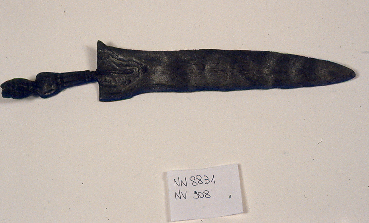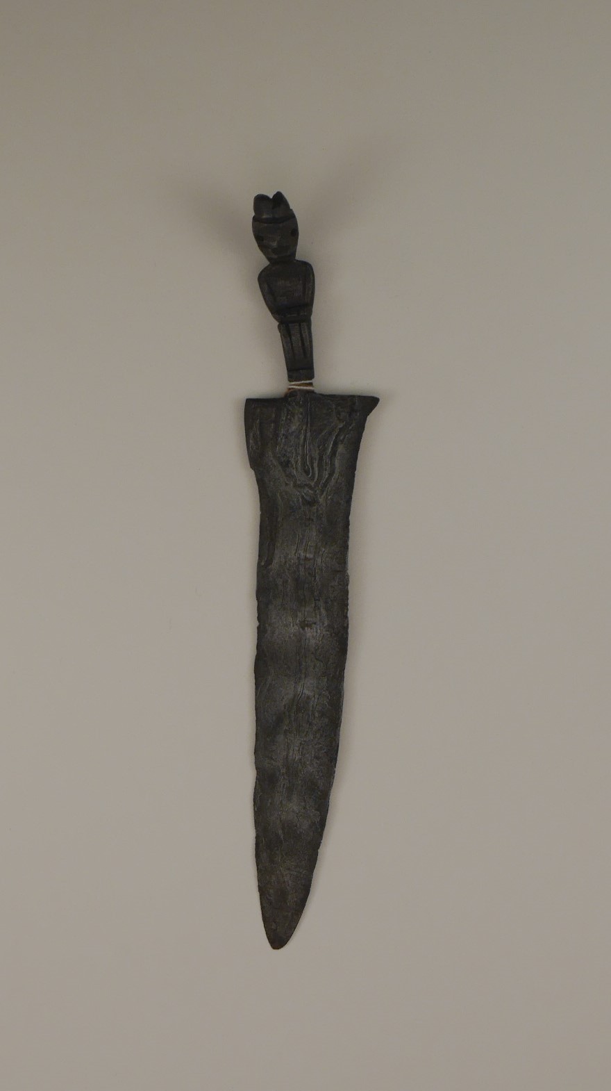 Keris sajen privo di fodero e proveniente da Giava. Il keris sajen (“offerta”), o deder iras per la caratteristica impugnatura creata in un solo pezzo con la lama, non è un'arma ma un oggetto cerimoniale considerato avere un grande valore esoterico e spirituale. Per questo motivo la lama, anche se piuttosto larga e lunga, è molto sottile e presenta una forma molto semplice mentre l'impugnatura è plasmata a raffigurare una figura umana interpretata come un antenato divinizzato: il capo, dai tratti somatici resi schematicamente, appare leggermente reclinato verso il petto e le mani sono poste sulle ginocchia in atteggiamento di solenne concentrazione. È realizzata interamente in acciaio damascato (stratificato) la cui trama crea un particolare di forma circolare chiamato batu lapak la forte (sorsoran) della lama, interessata da una serie di depressioni