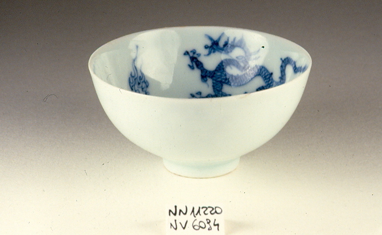 - NOTIZIE STORICO CRITICHE Sulla base, in blu sottocoperta, inscritto in un semplice cerchio, dipinto il marchio di regno: Da Ming Chenghua nian zhi ("fatto durante il regno Chenghua dei Grandi Ming", 1465-1488). Appartiene alla tipologia dei Bianco e Blu