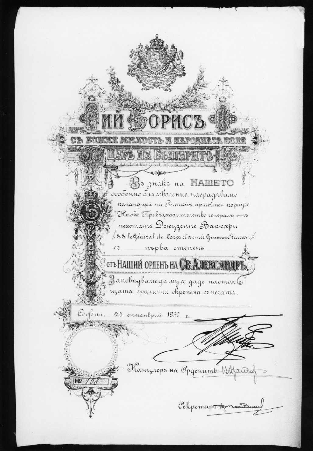 - NOTIZIE STORICO CRITICHE Si tratta dal diploma di conferimento di un'alta onorificenza da parte di re Boris II di Bulgaria a Giuseppe Vaccari il 25 settembre 1930 a Sofia