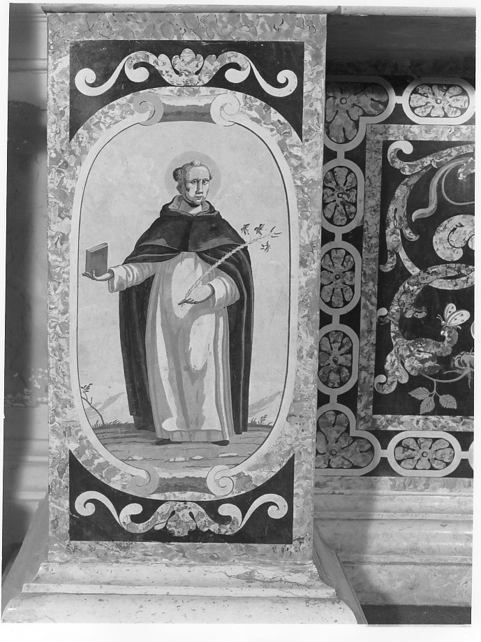 Personaggi: San Domenico. Attributi: (San Domenico) giglio; libro. Paesaggi: paesaggio con montagne. Decorazioni: cornice