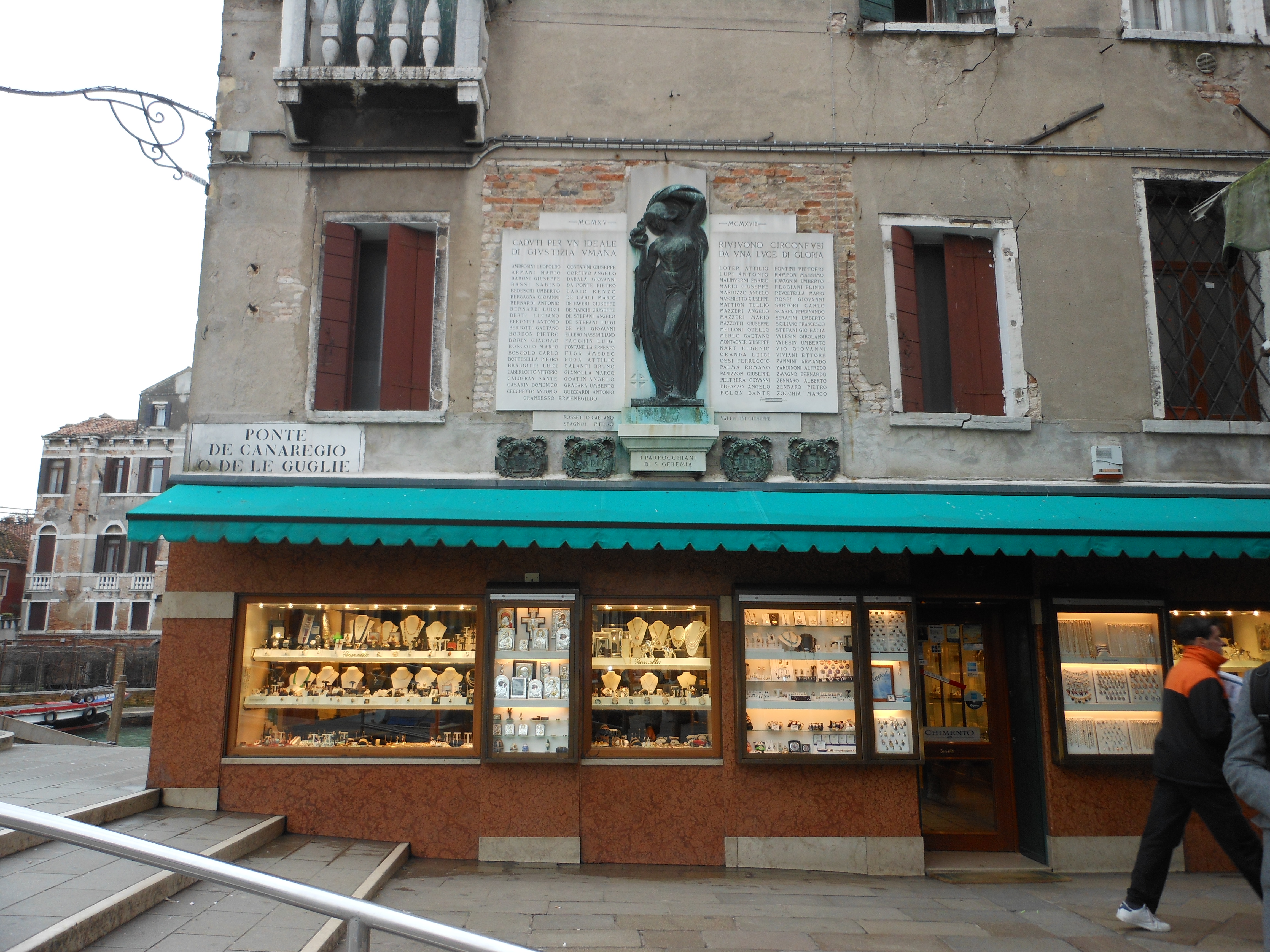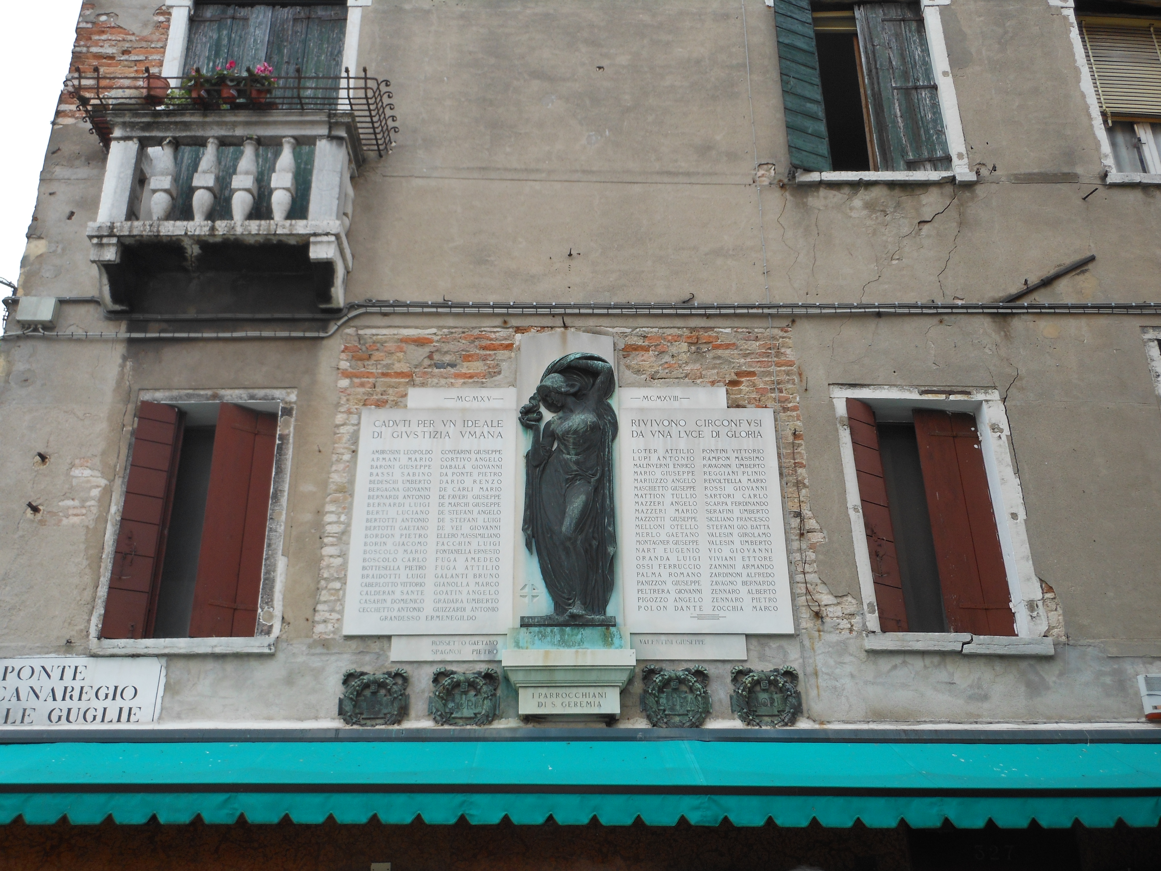 - NOTIZIE STORICO CRITICHE Qualche mese dopo l'inaugurazione della lapide è pervenuta al Comitato pro-lapide notizia che vi erano da aggiungere altri quattro nomi di soldati deceduti, così vennero aggiunti nella parte inferiore della lapide. L'autore dell'opera è la scultore Gaetano Rossi di cui però non si hanno ulteriori notizie. Il 24 settembre 1924 il signore Vittorio Bianchi, residente in Calle Flangini a San Geremia, chiese di poter realizzare le quattro corone in bronzo da porre vicino la lapide sulla facciata della casa di proprietà del signore Giuseppe Scarabellin all'anagrafico 327. ll progetto venne affidato allo scultore Gaetano Rossi che realizzò pure la lapide. Inoltre il 4 settembre lo scalpellino Giuseppe Cecchetto fece richiesta al Municipio di Venezia di poter passare in piombo tutti i nomi dei caduti. (Vedi Archivio Comunale Celestia, Venezia, posizione 1921-1925, IX/4/9, fascicolo: 48102/1924)