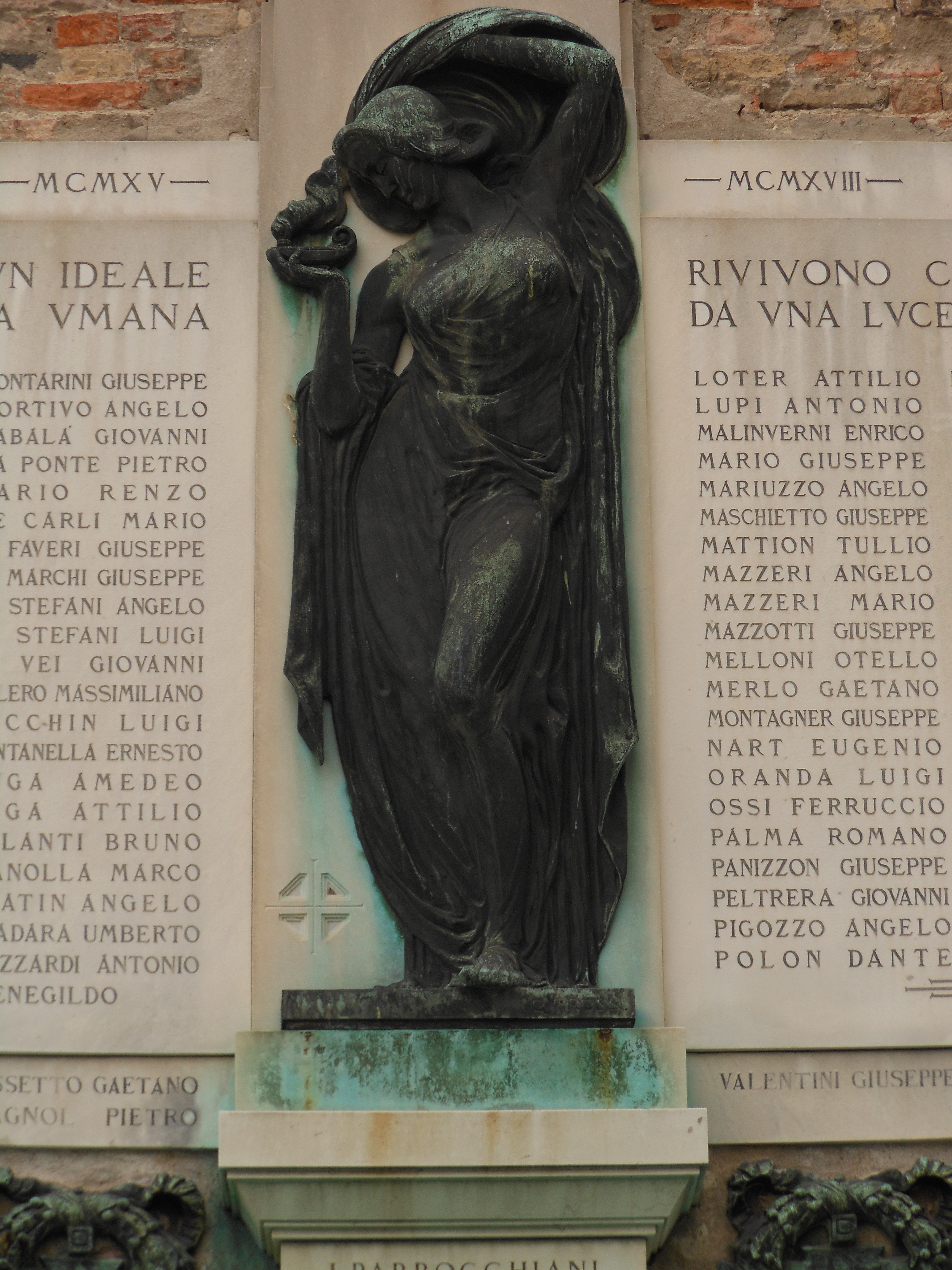 - ISCRIZIONI dalla lapide destra alla lapide sinistra - MCMXV- MCMXVIII / CADVTI PER VN IDEALE / DI GIVSTIZIA VMANA / RIVIVONO CIRCONFVSI / DA UNA LVCE DI GLORIA / AMBROSINI LEOPOLDO / ARMANI MARIO / BARONI GIUSEPPE / BASSI SABINO / BEDESCHI UMBERTO / BERGAGNA GIOVANNI / BERNARDI ANTONIO / BERNARDI LUIGI / BERTI LUCIANO / BERTOTTI ANTONIO / BERTOTTI GAETANO / BORDON PIETRO / BORIN GIACOMO / BOSCOLO MARIO / BOSCOLO CARLO / BOTTESELLA PIETRO / BRAIDOTTI LUIGI / CABERLOTTO VITTORIO / CALDERAN SANTE / CASARIN DOMENICO / CECCHETTO ANTONIO / CONTARINI GIUSEPPE / CORTIVO ANGELO / DABALÀ GIOVANNI / DA PONTE PIETRO / DARIO RENZO / DE CARLI MARIO / DE FAVERI GIUSEPPE / DE MARCHI GIUSEPPE / DE STEFANI ANGELO / DE STEFANI LUIGI / DE VEI GIOVANNI / ELLERO MASSIMILIANO / FACCHIN LUIGI / FONTANELLA ERNESTO / FUGA AMEDEO / FUGA ATTILIO / GALANTI BRUNO / GIANOLLA MARCO / GOATIN ANGELO / GRADARA UMBERTO / GUIZZARDI ANTONIO / GRANDESSO ERMENEGILDO / ROSSETTO GAETANO / SPAGNOL PIETRO / LOTER ATTILIO / LUPI ANTONIO / MALINVERNI ENRICO / MARIO GIUSEPPE / MARIUZZO ANGELO / MASCHIETTO GIUSEPPE / MATTION TULLIO / MAZZERI ANGELO / MAZZERI MARIO / MAZZOTTI GIUSEPPE / MELLONI OTELLO / MERLO GAETANO / MONTAGNER GIUSEPPE / NART EUGENIO / ORANDA LUIGI / OSSI FERRUCCIO / PALMA ROMANO / PANIZZON GIUSEPPE / PELTRERA GIOVANNI / PIGOZZO ANGELO / POLON DANTE / PONTINI VITTORIO / RAMPON MASSIMO / RAVAGNIN UMBERTO / REGGIANI PLINIO / REVOLTELLA MARIO / ROSSI GIOVANNI / SARTORI CARLO / SCARPA FERDINANDO / SERAFINI UMBERTO / SICILIANO FRANCESCO / STEFANI GIO. BATTA. / VALESIN GIROLAMO / VALESIN UMBERTO / VIO GIOVANNI / VIVIANI ETTORE / ZANNINI ARMANDO / ZARDINONI ALFREDO / ZAVAGNO BERNARDO / ZENNARO ALBERTO / ZENNARO PIETRO / ZOCCHIA MARCO / VALENTI GIUSEPPE / I PARROCCHIANI DI S. GEREMIA - lettere capitali e numeri romani -