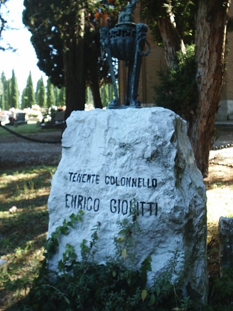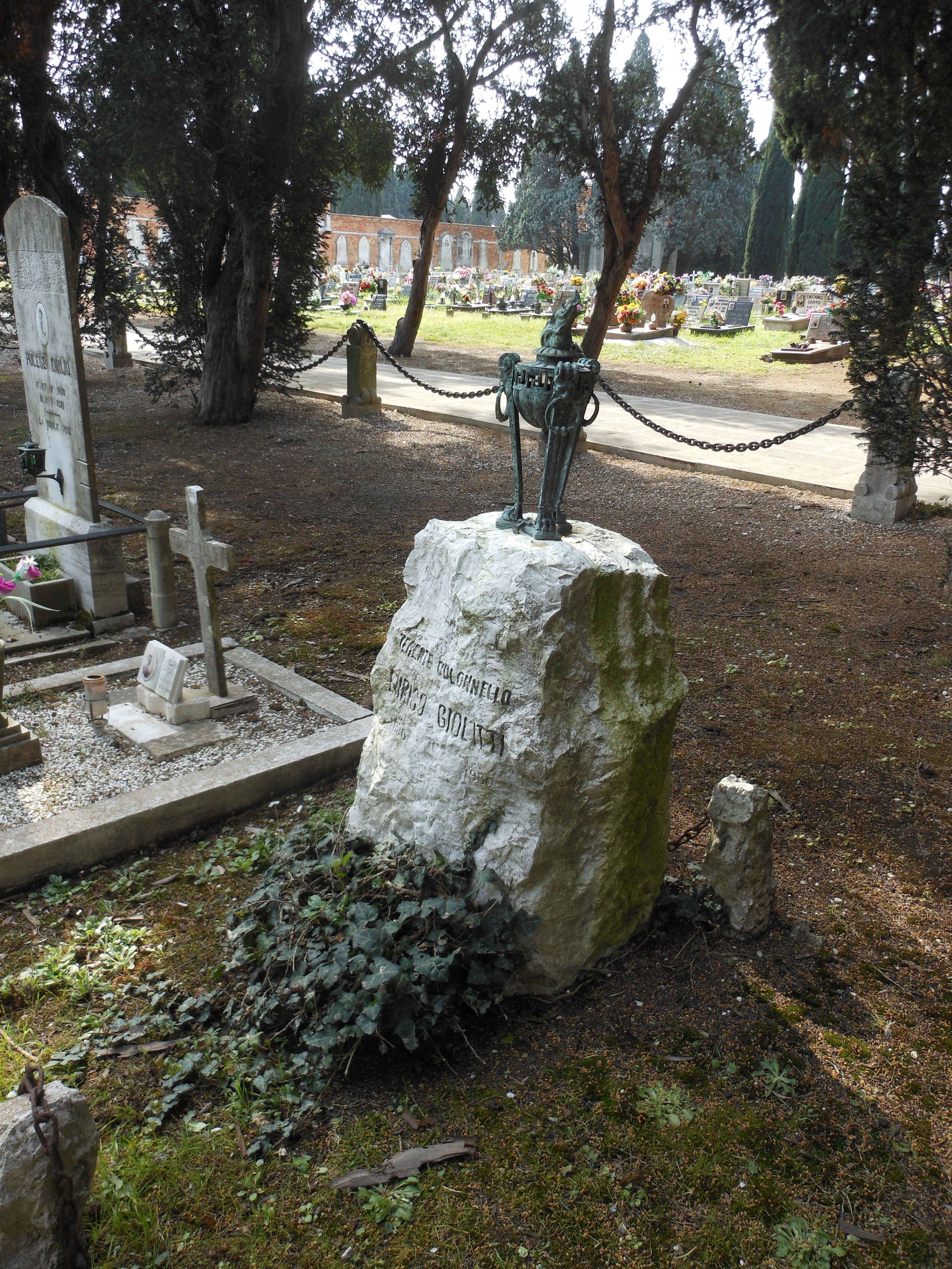 La tomba è costituita da una roccia grezza su cui è riportato inciso il nome del colonnello Enrico Giolitti e la sua data di nascita e morte. Sopra la roccia è posta una lampada votiva in bronzo. La tomba è delimitata da quattro pilastrini in roccia collegati tra loro da una catena ad anelli in ferro