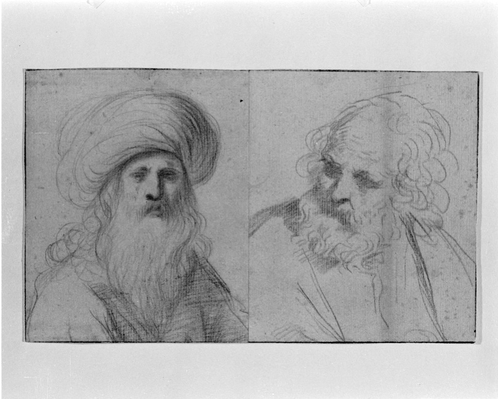 - NOTIZIE STORICO CRITICHE L'attribuzione dei due fogli al Guercino avanzata dal Selvatico (1854) Due teste, una che pare un Abramo, l'altra San Giuseppe è stata messa in dubbio da Venturi (1910). I due disegni, forse due frammenti di un unico foglio, riuniti per esigenze compositive derivano da un prototipo guercinesco, come ha suggerito il Turner (com. or. 1990). In particolare, la testa sinistra col turbante ricorda un foglio a Windsor Castle (Royal Library, inv. 2826; Mahon-Turner 1989, n.307, Turner-Plazzotta 1991,n.207) realizzato con maggior vigore. Il San Giuseppe (?) a destra è molto prossimo ad un foglio del Guercino in collezione Katalan al New York ( Stone 1991, p. 224, n.184, riprodotto a p. 233) in controparte rispetto al nostro