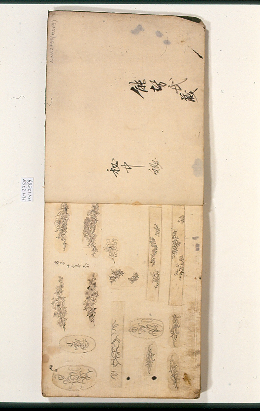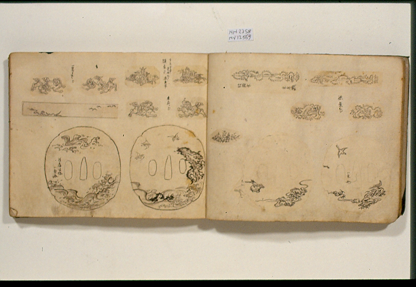 - NOTIZIE STORICO CRITICHE Libro di modelli decorativi di accessori per la spada. Rilegatura fukurotoji. Contiene 40 fogli piegati a più soggetti per pagina, disegnati singolarmente o a gruppi su velina incollata alle pagine. Alcuni disegni sono mancanti. Campionario di disegni su carta sottile incollati alle pagine: motivi decorativi per "tsuba" (else di spada) e altri accessori. La maggior parte dei disegni sono in b.n., ma alcuni presentano dei tocchi di colore