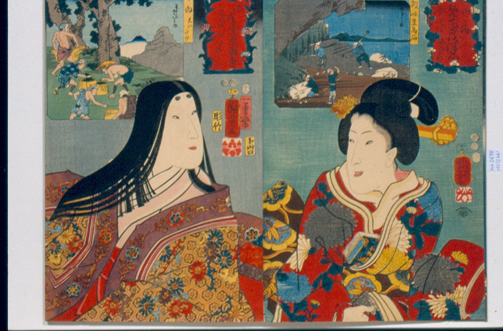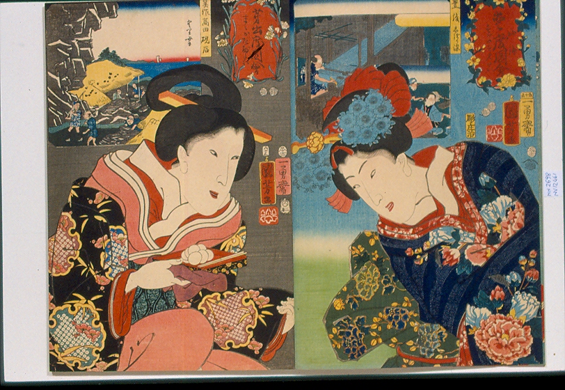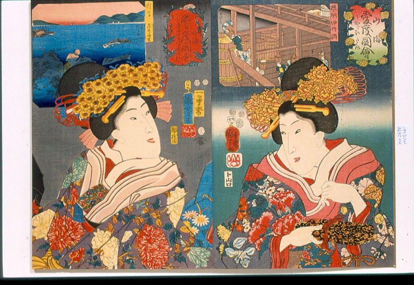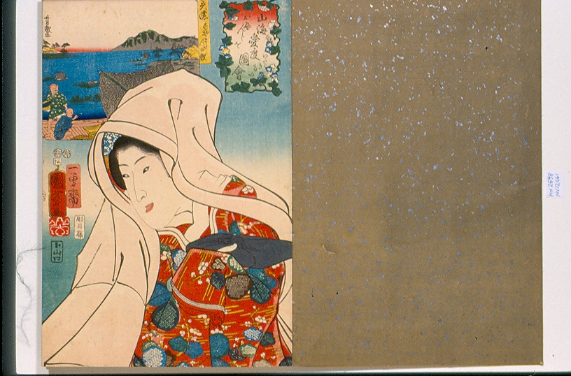 Libro verticale di tipo "orihon" a fisarmonica con copertina leggermente lucida color nocciola con motivi geometrici di cerchi iscritti in rombi; 38 silografie a colori estremamente vividi con raffigurazioni femminili; ogni immagine occupa una pagina; controguardie in washi (carta giapponese) spruzzata a foglia d'oro