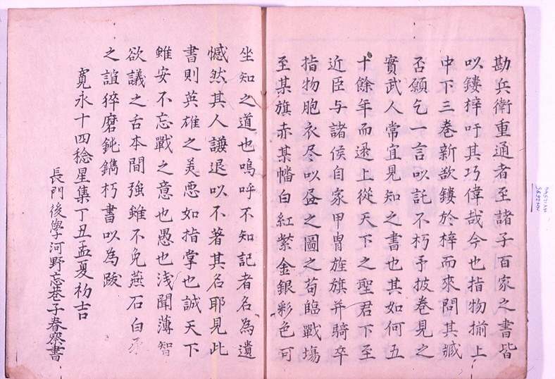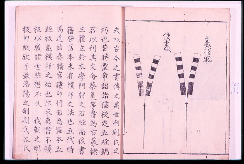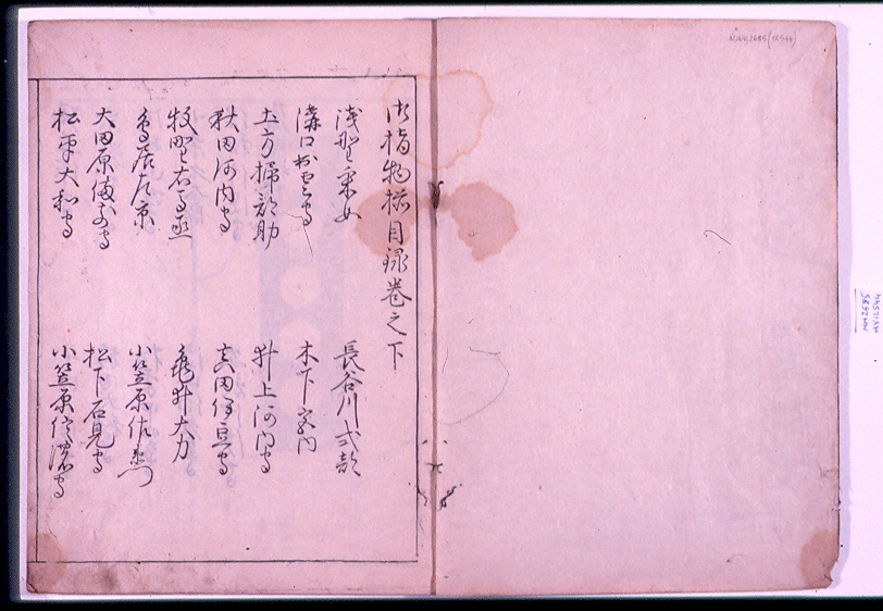 - NOTIZIE STORICO CRITICHE Il libro riporta un'etichetta sulla quarta di copertina con i bordi blu con il numero 10182 battuto a macchina e il numero 909 scritto a mano con inchiostro nero. Sono presenti 34 fogli piegati, 2 facciate di prefazione e 3 di postfazione, più una facciata vuota (controguardia anteriore), 129 immagini di modelli di stendardi suddivisi a due o tre per ogni facciata (57 facciate a due soggetti, 5 facciate a tre soggetti); silografie in b.n. Luogo di stampa è Edo (l'attuale Tōkyō)