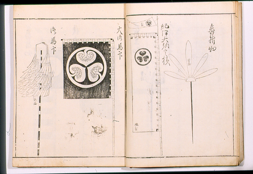 - NOTIZIE STORICO CRITICHE Il libro presenta macchie di umidità sul bordo esterno. Libro contenente immagini relative al design delle diverse componenti di bandiere e vessilli. Primo volume di tre.Sono presenti 49 fogli piegati, 5 facciate di prefazione, più una facciata vuota (controguardia anteriore), 205 immagini di modelli di stendardi suddivisi a due, tre o cinque per ogni facciata (1 facciata con 5 soggetti, 18 facciate con 3 soggetti, 73 facciate con 2 soggetti); silografie in b.n. Luogo di stampa è Edo (l'attuale Tōkyō)