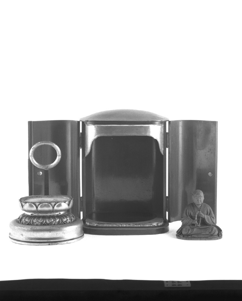 Scultura di monaco inginocchiato con rosario. Poggia su una base separata: circolare con ultimo gradino a fiore di loto, sorregge la nimbatura della figura