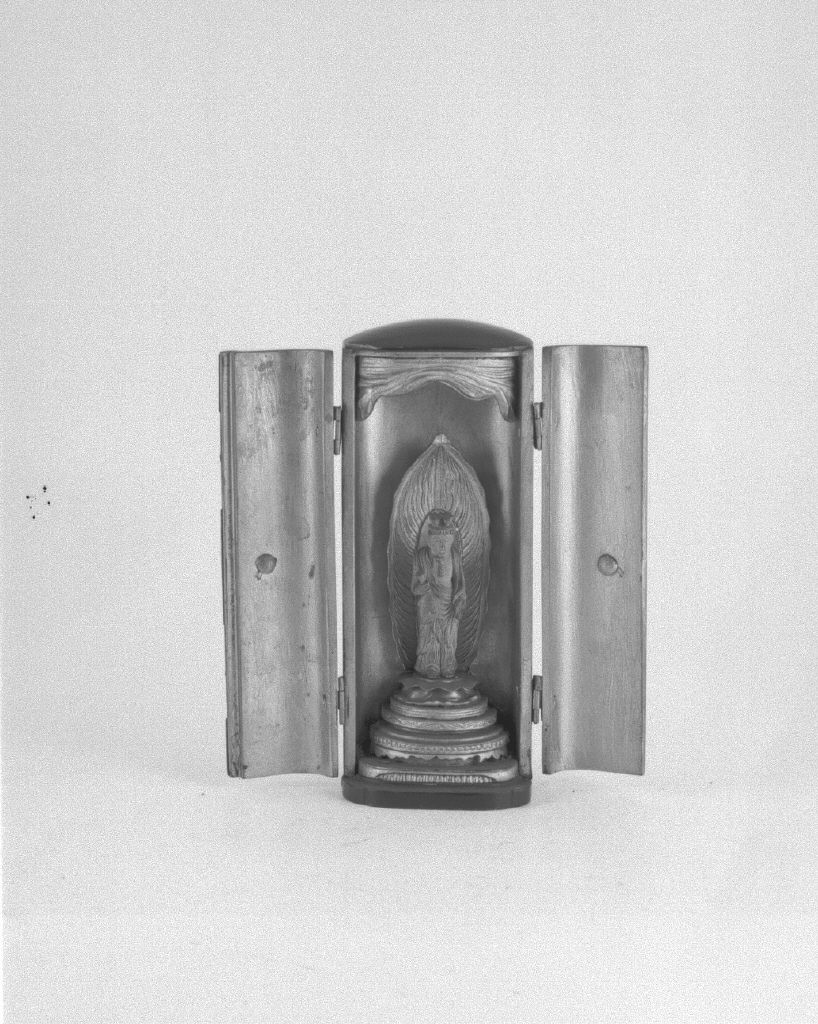 Altarino domestico portatile per divinità buddista. Di forma rettangolare bombata con piccolo coperchio superiore. Esterno in lacca nera con elaborate decorazioni a forma di girali sulle ante e la chiusura. L'interno, oltre una cornice intagliata, ospita la statuetta della divinità