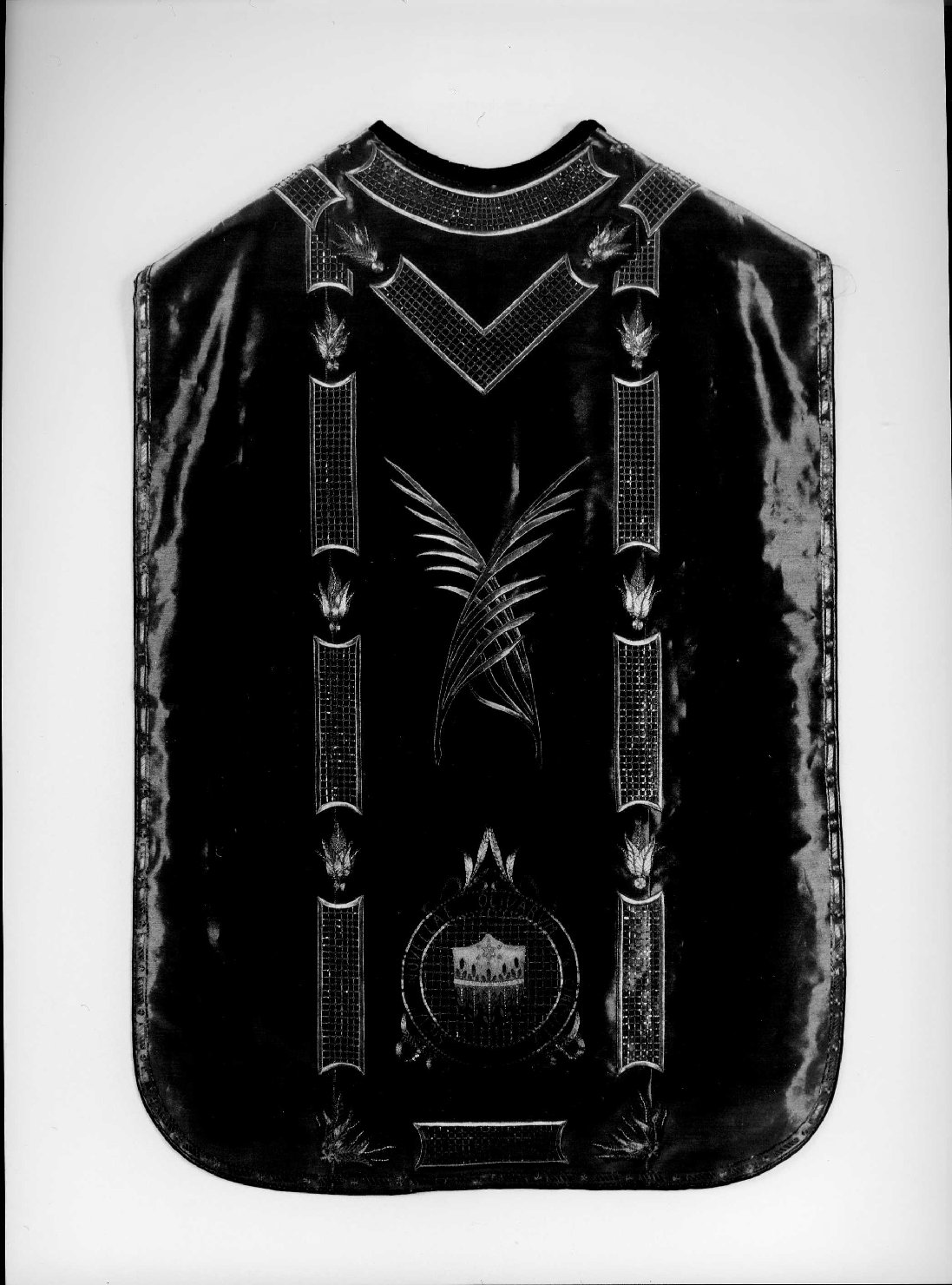 Davanti sono ricamati entro un tondo due pesci separati da un'ancora; lungo il bordo del tondo corrono le lettere greche alfa e omega. Nella parte posteriore, al centro due rami di palma incrociati, in basso entro un tondo lo stemma dell'ordine delle Orsoline
